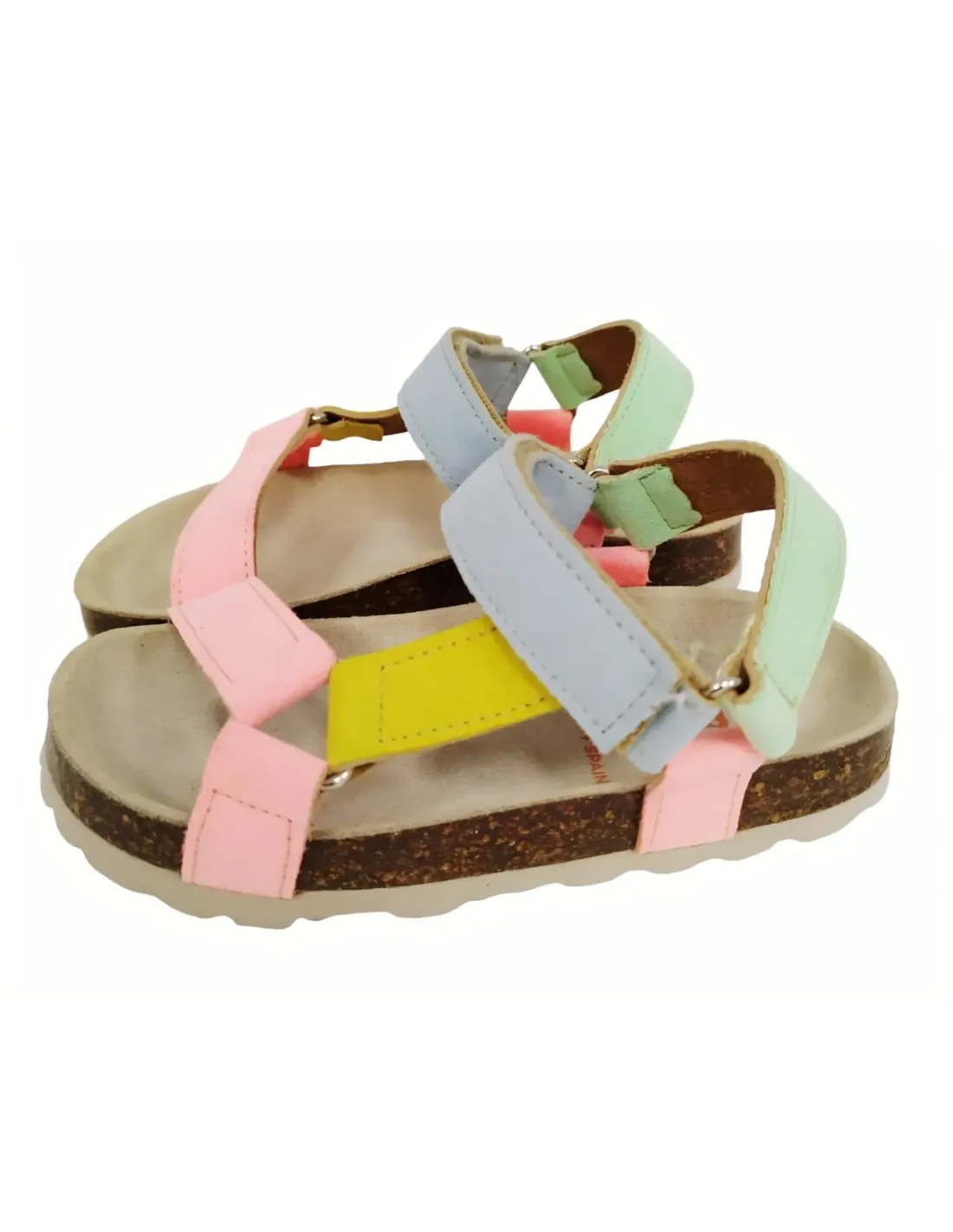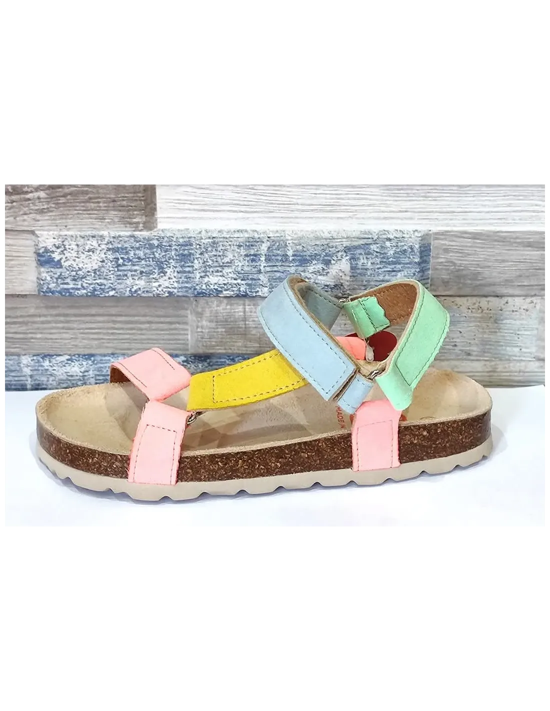 Sandalia en piel natural con tiras multicolor. Cierre mediante correa de velcro ajustable. Plantilla bio, anatómica, en cuero que permite la correcta transpiración del pie. Suela de caucho sobre base de goma antideslizante.