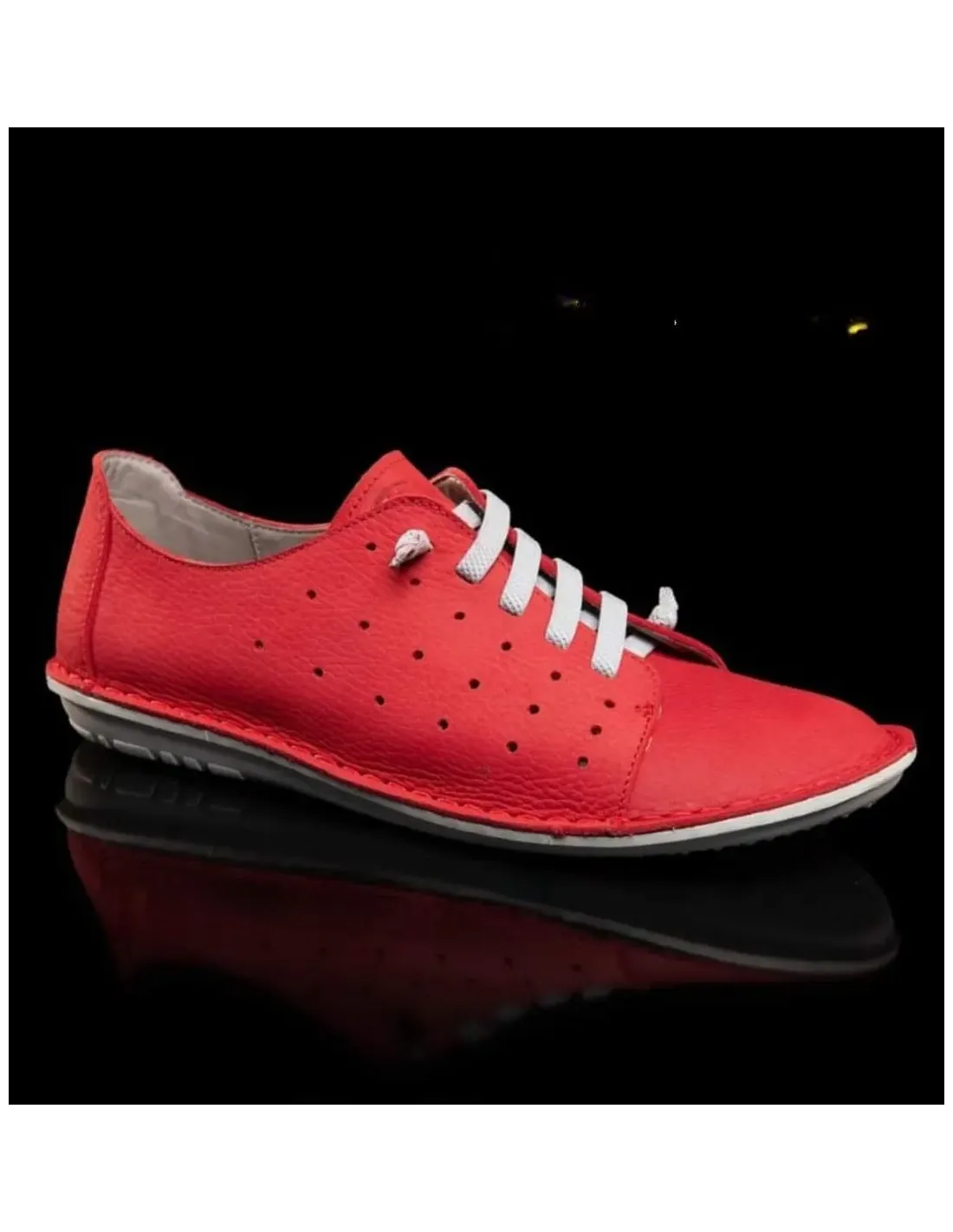 Zapato en piel con troquelados en los laterales. Cierre mediante cordones engomados que facilitan la puesta y aseguran un gran amarre. Forro y plantilla, acolchada, de cuero que permite la correcta transpiración del pie. Suela de goma antideslizante. Muy flexibles, ligeros y con puntera ancha que permite la libre movilidad de los dedos.
