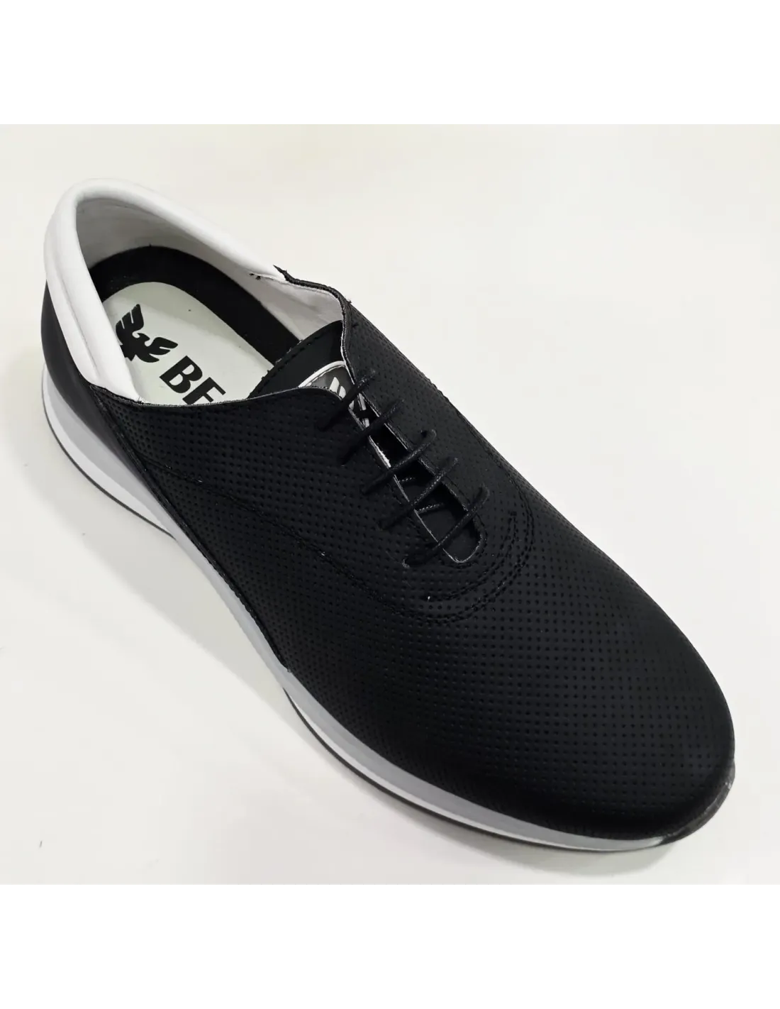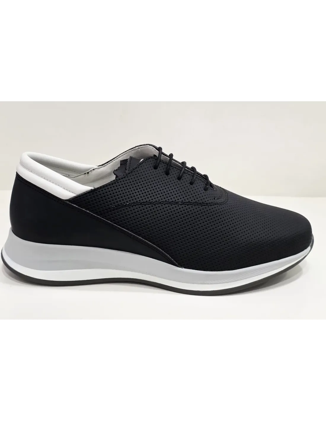 Zapato de tipo casual en piel natural con empuñadura acolchada en blanco. Cierre mediante cordones ajustables. Forro de cuero con plantilla anatómica, acolchada de descanso, extraíble. Suela de tipo deportivo antideslizante.