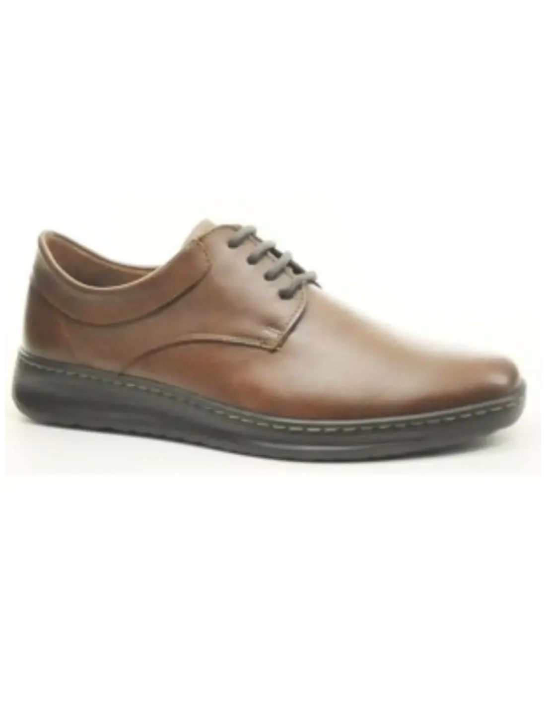 Zapato en piel natural en tono chocolate. Cierre mediante cordón ajustable, de algodón. Forro y plantilla, acolchada de descanso, en cuero que favorece la transpiración del pie. Suela de goma antideslizante.