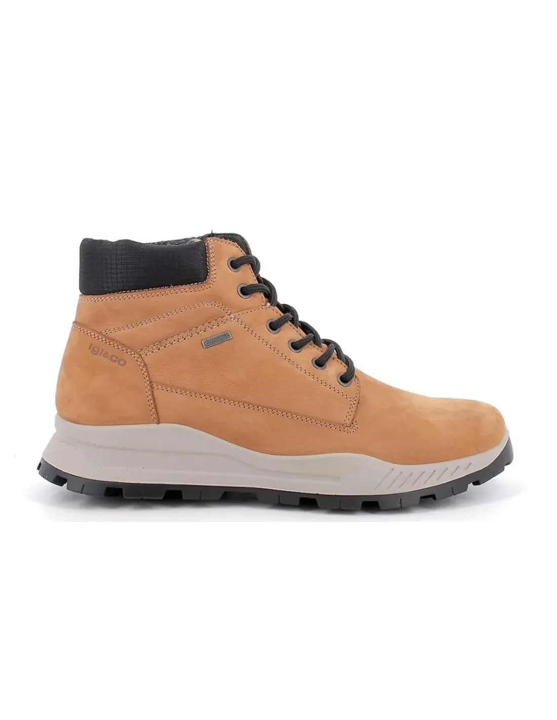 Bota técnica de piel con membrana de Goretex. Acolchado interior suave en contraste para una protección envolvente. Plantilla extraíble de espuma memory recubierta de piel que asegura amortiguación y protección del pie de las rozaduras. Cierre mediante cordones ajustables, de algodón.  Suela antideslizante, serrada, en goma.