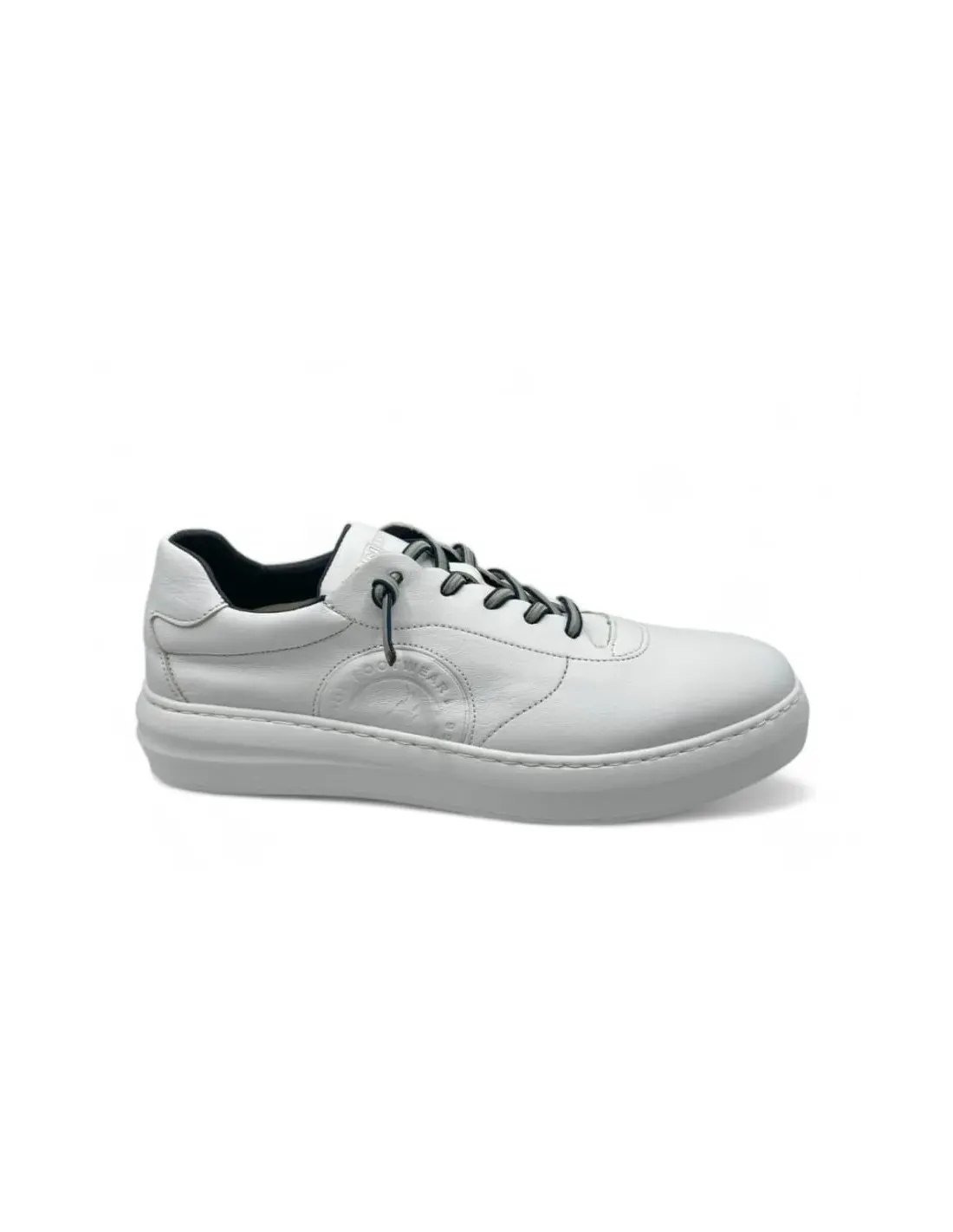 Zapato deportivo en piel natural con cordones elásticos. Forro de cuero y plantilla anatómica, acolchada, de descanso. Suela de goma antideslizante
