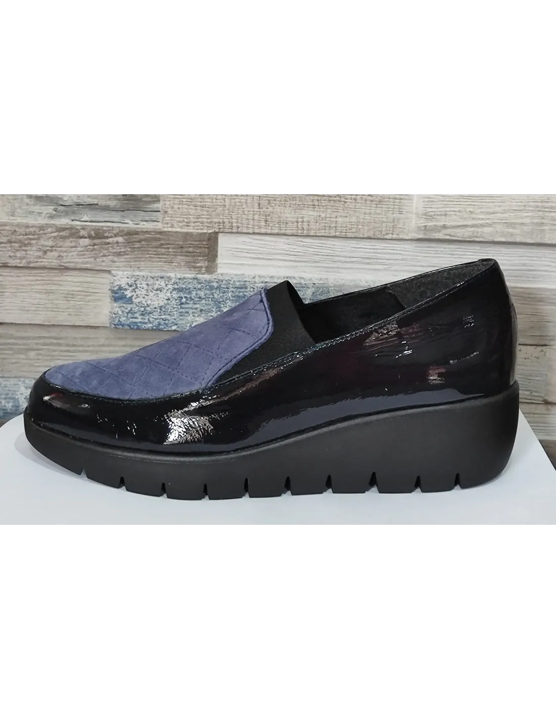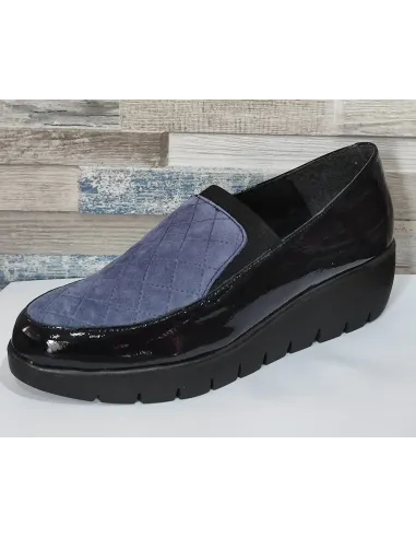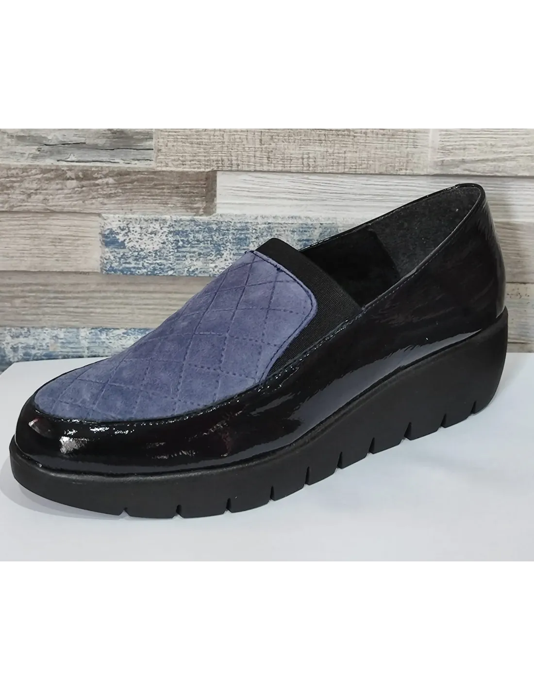 Zapato en piel de serraje y charol piel, de corte mocasín. Forro y plantilla, acolchada de descanso, en cuero. Suela de cuña en goma antideslizante.