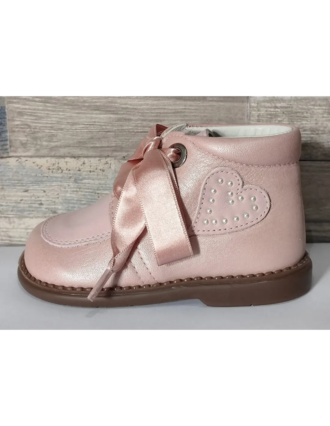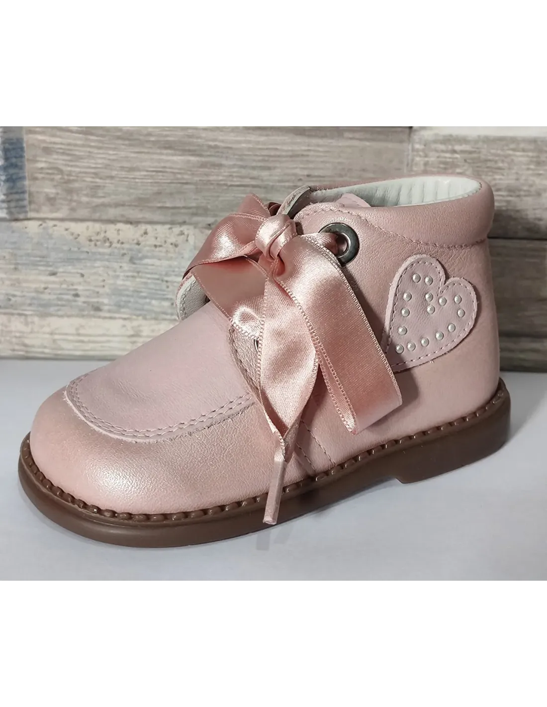 Botita en piel napa en diferentes texturas. Cierre mediante cordón de lazo, intercambiable por cordón de algodón (incluido). Acolchado en empuñadura. Forro y plantilla, extraíble, de cuero. Suela de goma antideslizante. Adorno lateral en forma de corazón con pequeños adornos metálicos.