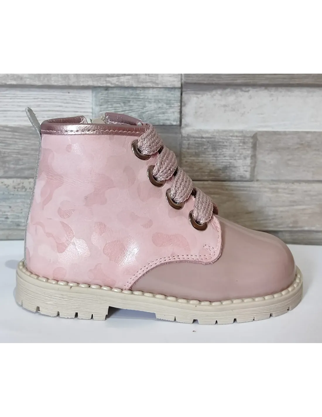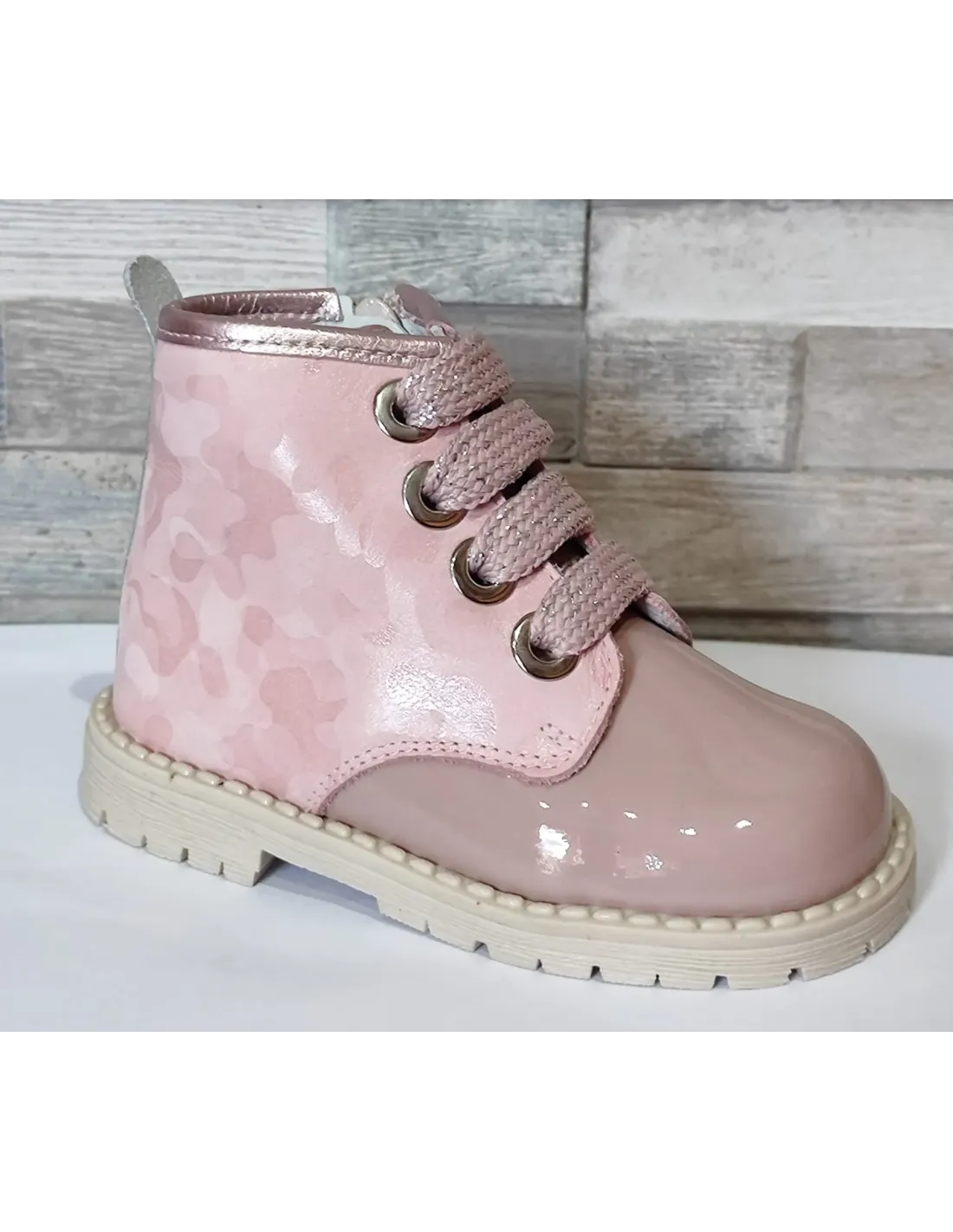 Bota de corte militar que combina charol piel con piel napa efecto camuflaje. Cierre mediante cremallera lateral con cordones ajustables de algodón. Forro y plantilla, extraíble, de cuero. Suela de goma antideslizante
