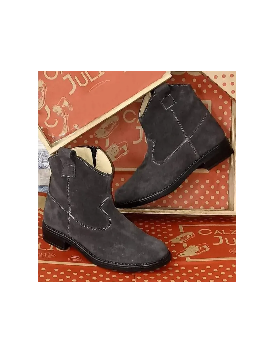 Botín campero en serraje natural con tirador lateral para facilitar la puesta. Cierre mediante cremallera lateral interior. Forro y plantilla de cuero. Suela serrada de goma antideslizante