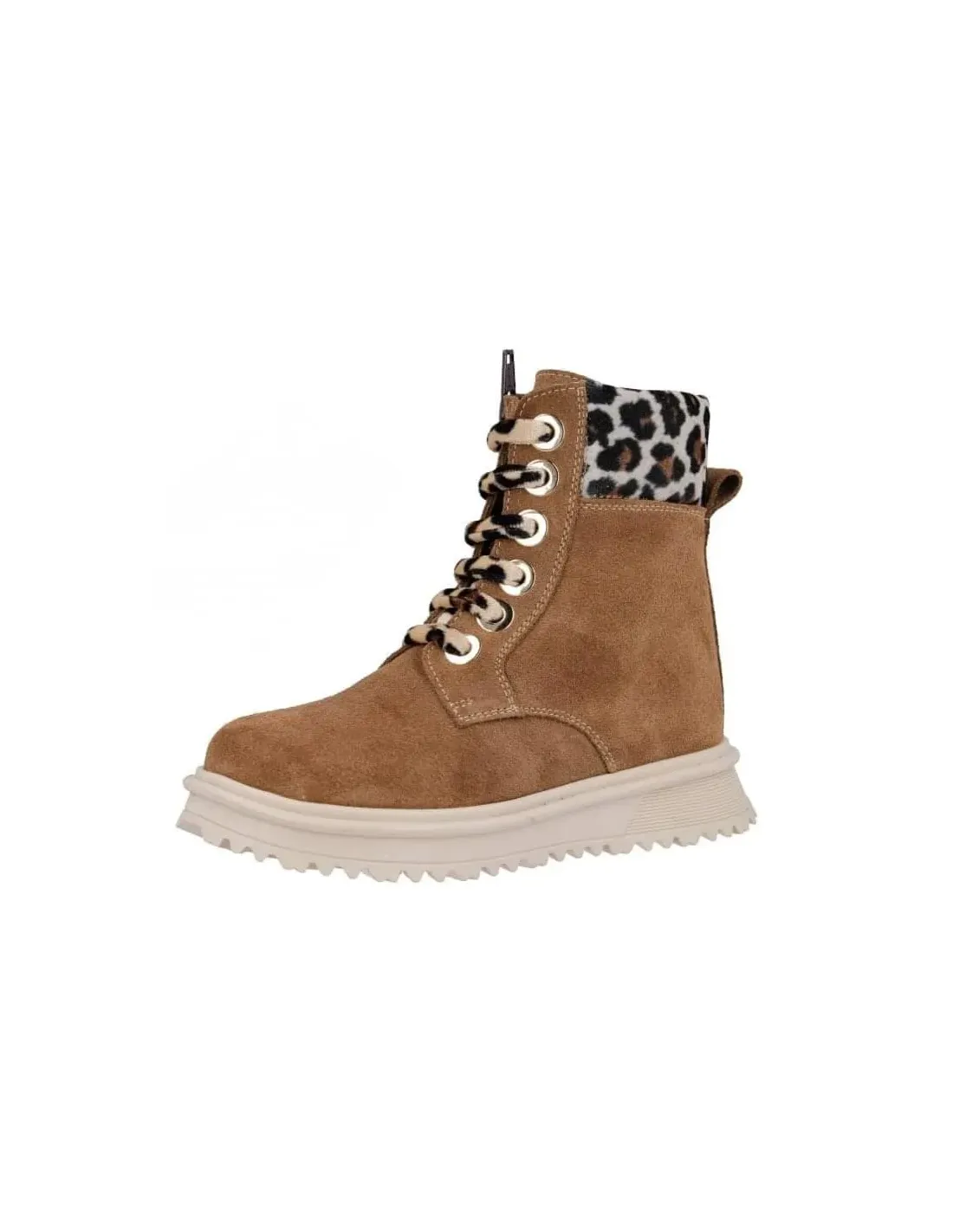 Bota de corte militar en serraje natural con empuñadura y cordones en animal print, de toque sedoso. Cierre mediante cremallera lateral con cordones ajustables. Forro y plantilla, extraíble, de cuero. Suela de goma, estilo deportivo, antideslizante
