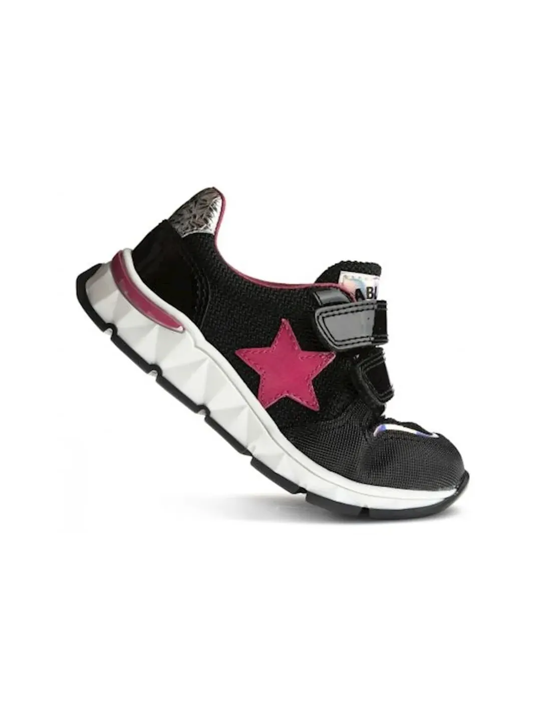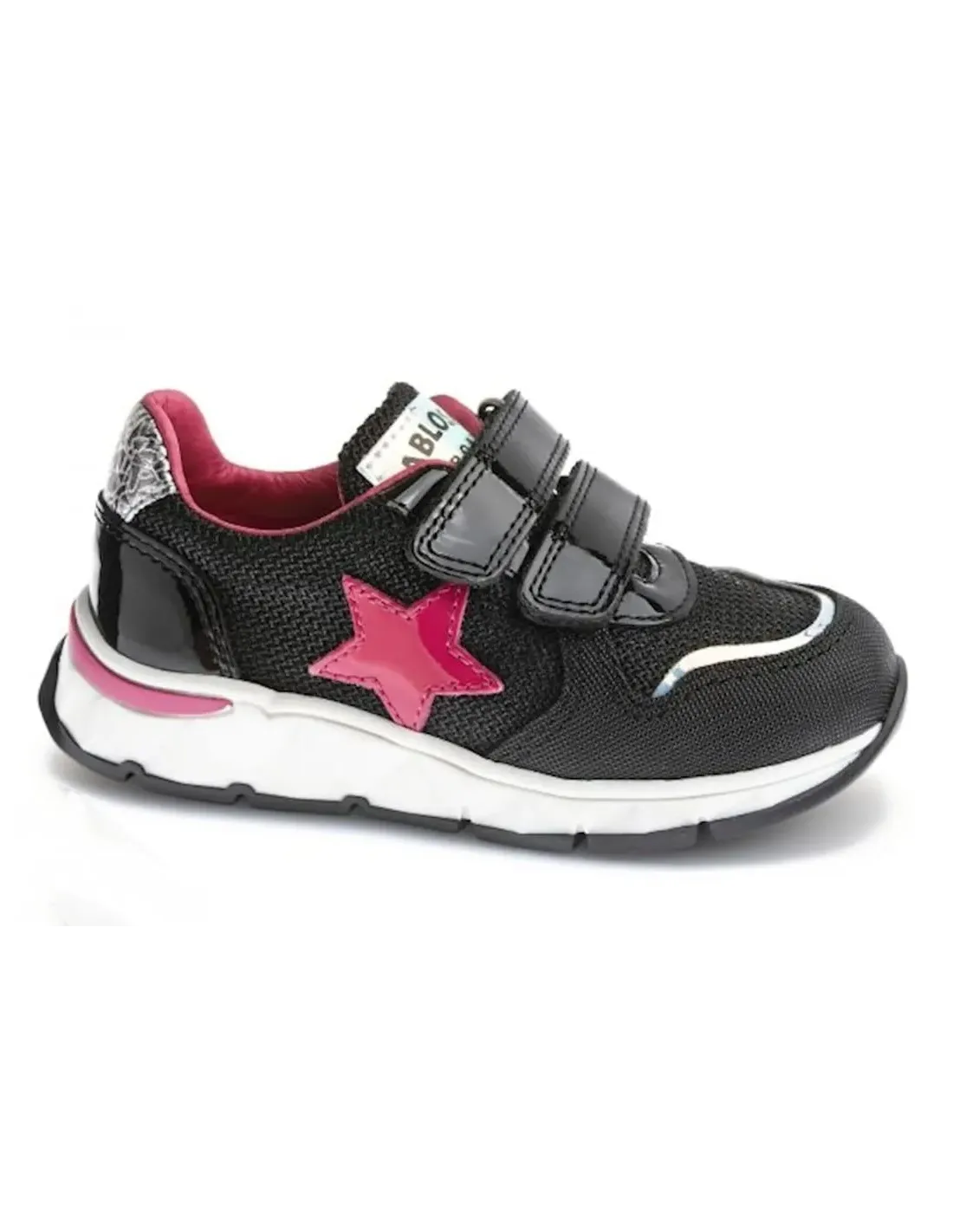 Deportivo en charol piel combinado con nylon. Cierre de velcro con cordones elásticos y puntera reforzada.  Forro y plantilla, extraíble,  de cuero.  Suela ultraligera de goma antideslizante.