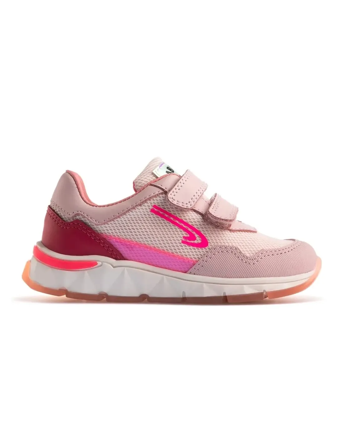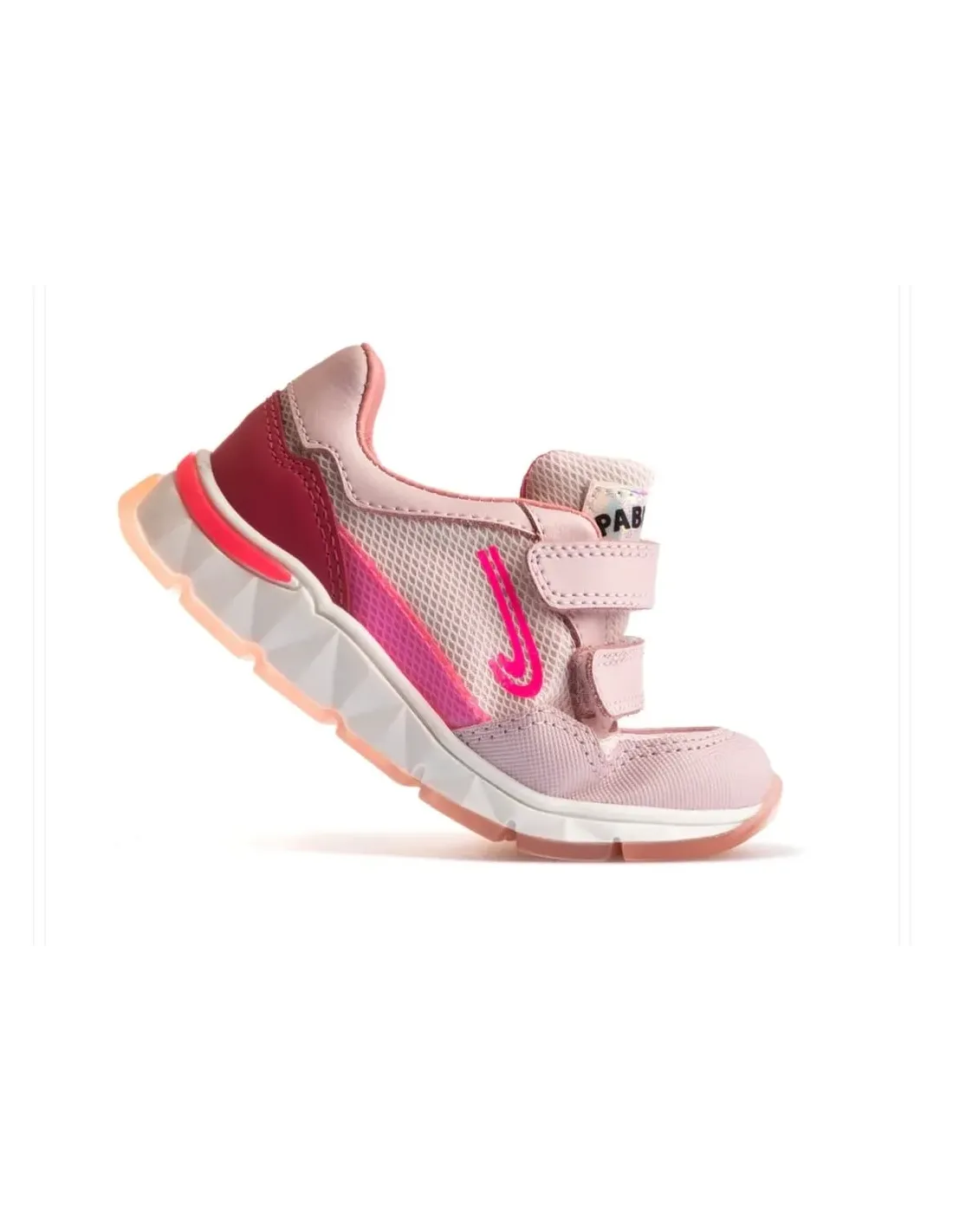 Deportivo en charol piel combinado con nylon. Cierre de velcro con cordones elásticos y puntera reforzada.  Forro y plantilla, extraíble,  de cuero.  Suela ultraligera de goma antideslizante.