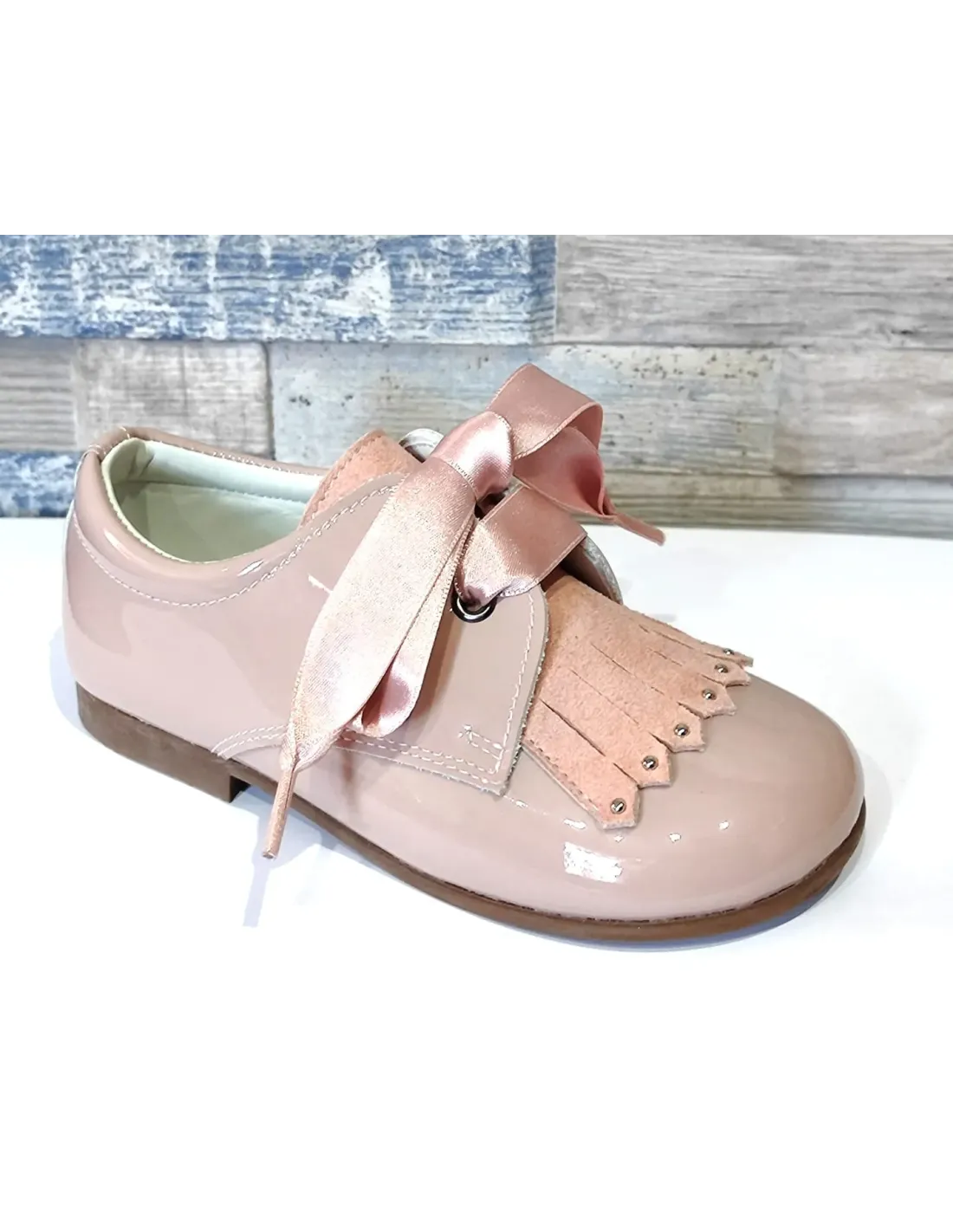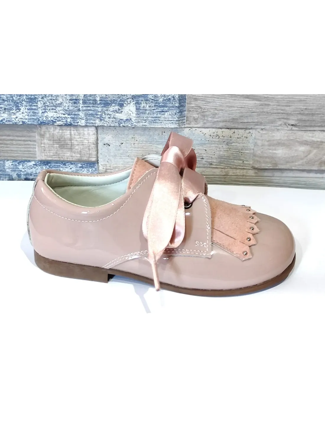 Zapato tipo blucher en charol piel con lengüeta en ante terminada en piezas metálicas. Cierre mediante lazo, ajustable, intercambiable por cordón de algodón, incluido. Empuñadura acolchada. Forro y plantilla, extraíble, de cuero. Suela de goma antideslizante.