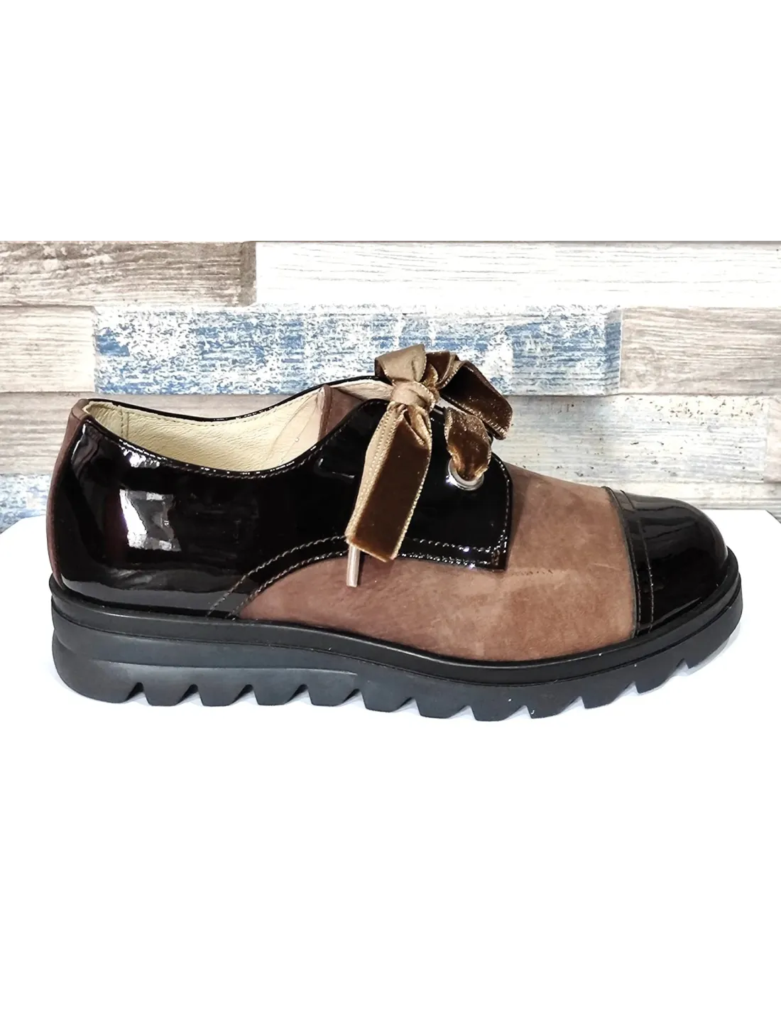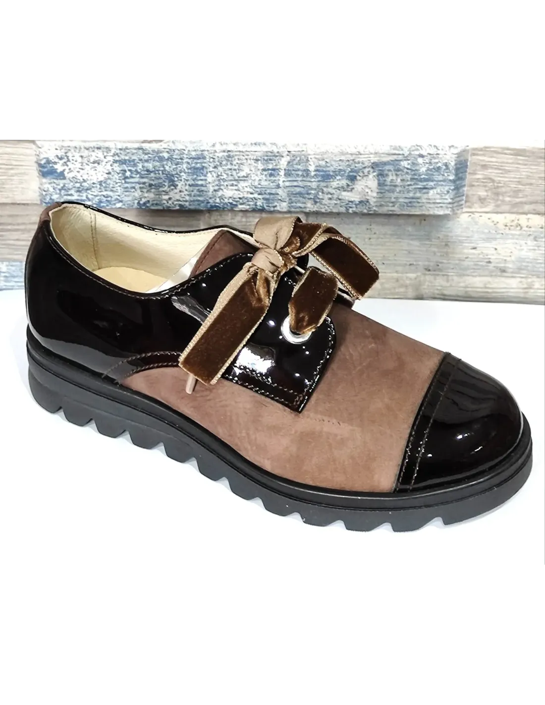 Zapato de estilo blucher que combina charol piel con piel nobuk. Cierre mediante cordón de terciopelo, intercambiable por cordón de algodón, incluido.  Forro y plantilla, extraíble, de cuero. Suela serrada de goma antideslizante