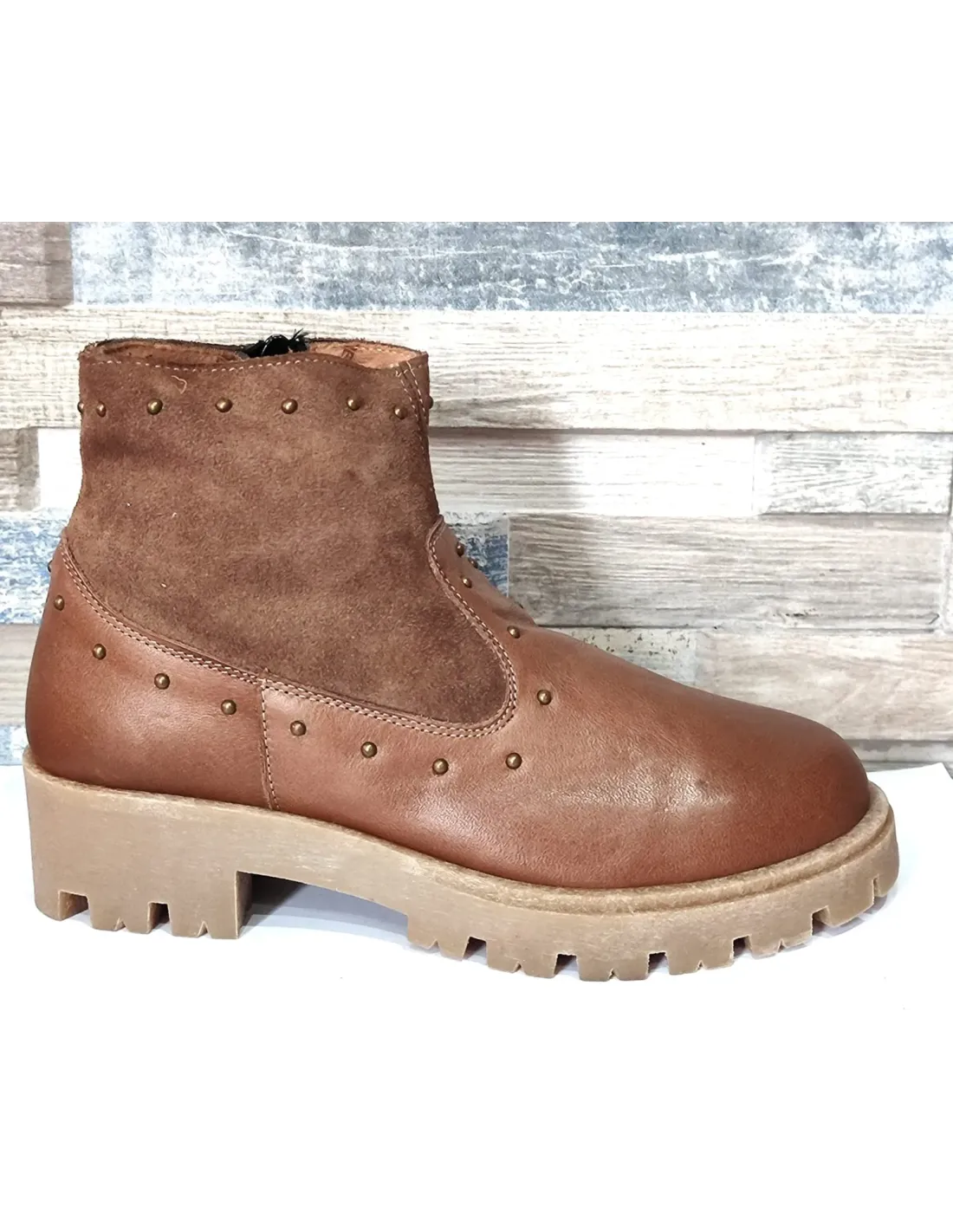 Botín de corte chelsea en piel combinado con serraje. Adorno de tachuelas. Cierre mediante cremallera lateral interior. Forro y plantilla, extraíble, de cuero. Suela gruesa serrada de goma antideslizante.