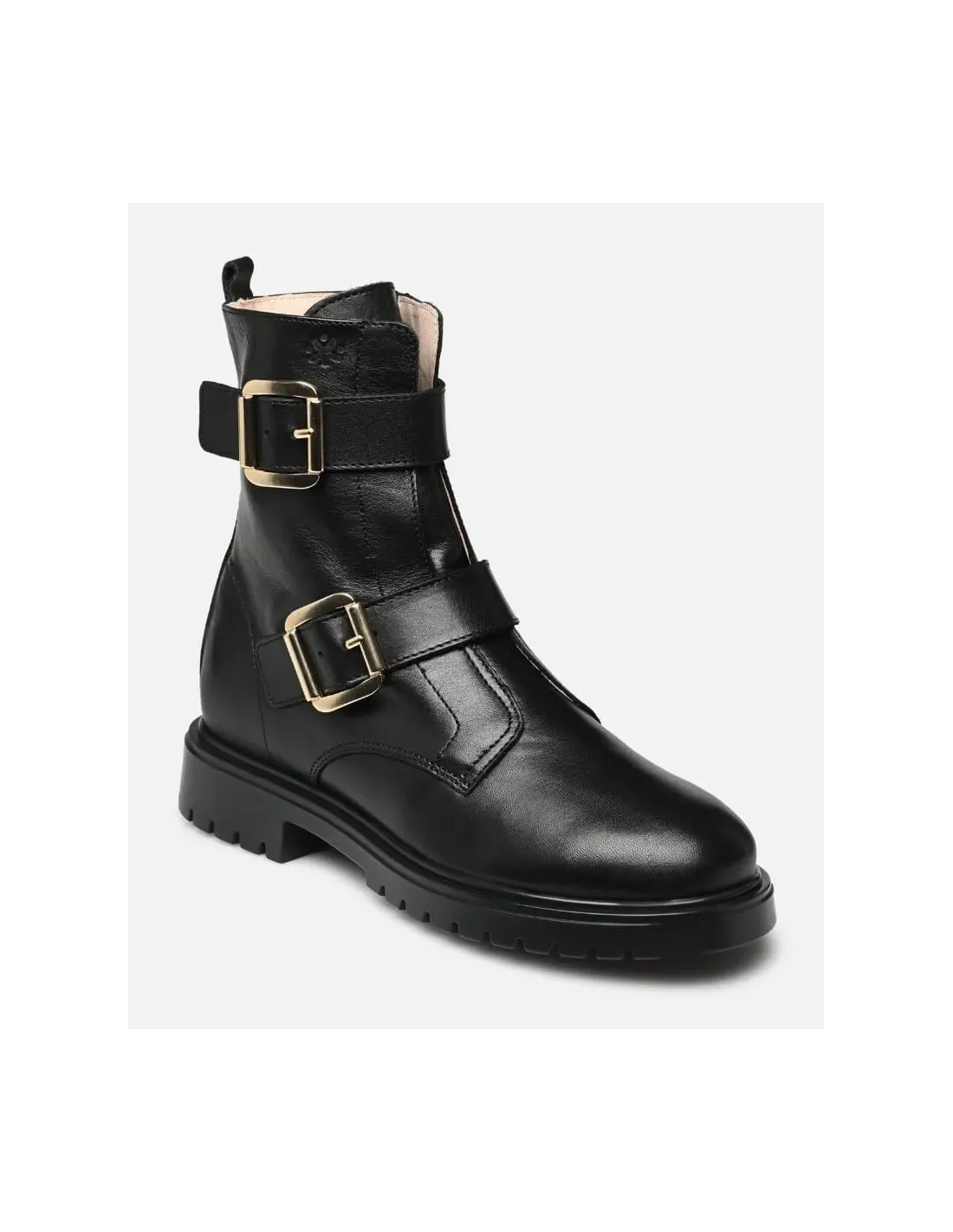 Bota de corte militar en piel, muy dulce. Cierre mediante cremallera lateral interior con adorno de correas en empeine y empuñadura, de hebillas metálicas, ajustables. Forro y plantilla de cuero. Suela serrada antideslizante de goma.