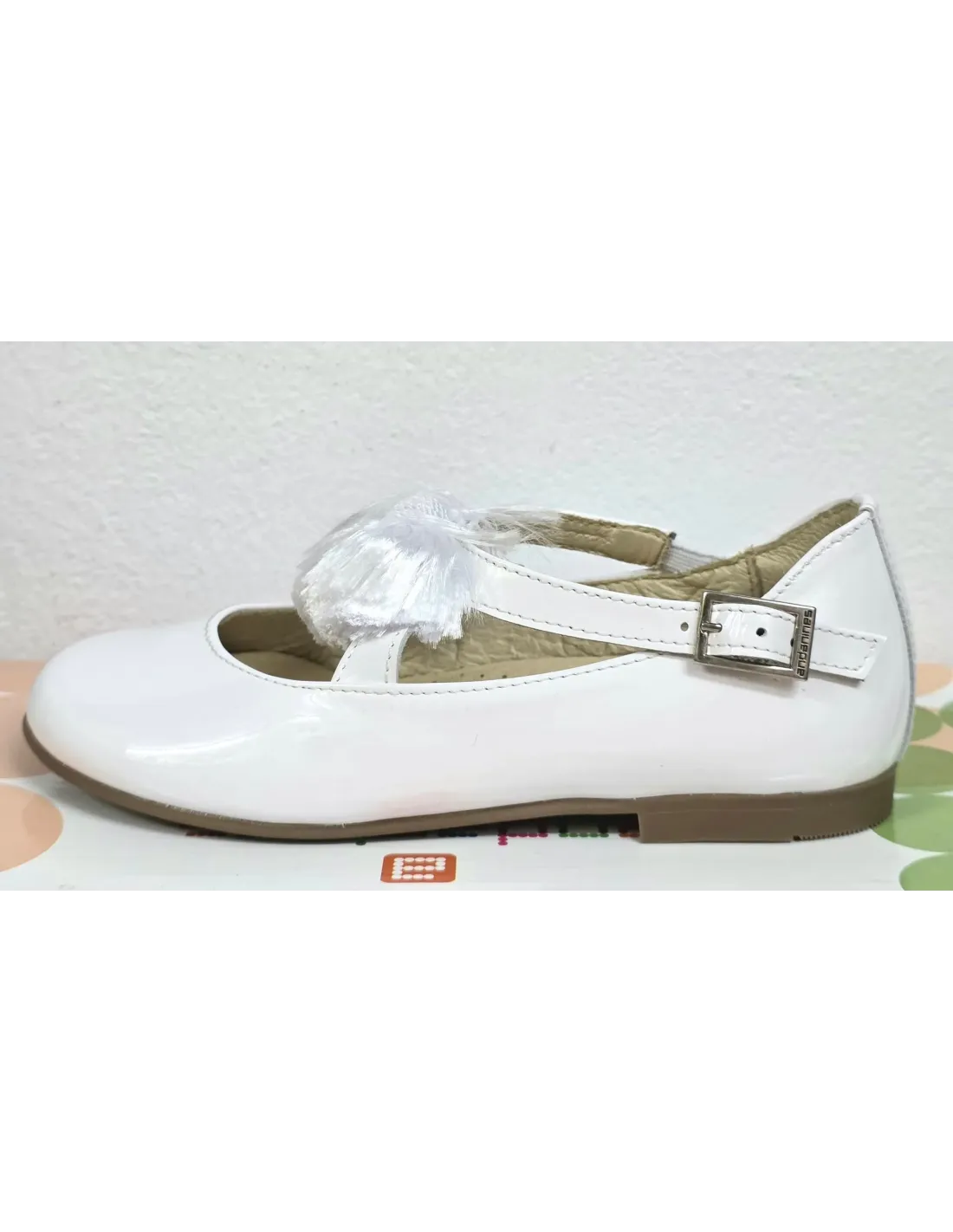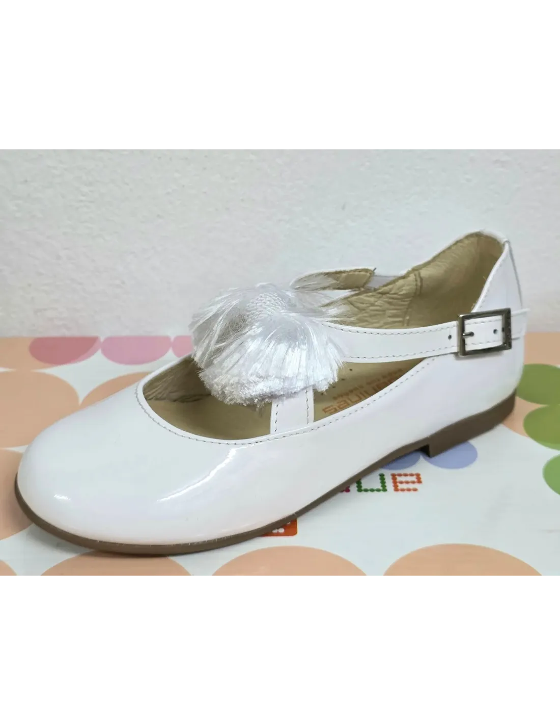 Zapato en piel natural nacarado, de ceremonia. Adorno de flor en tul en la pala. Cierre mediante correa de cuero, de hebilla. Forro y plantilla, extraíble, de cuero. Suela de goma antideslizante.