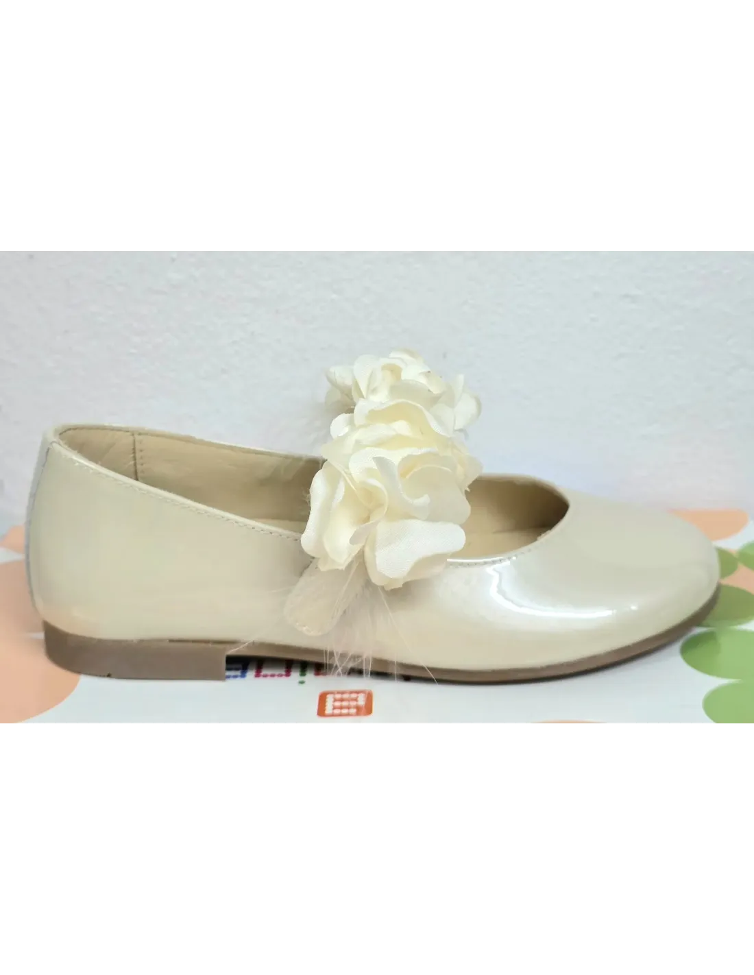 Zapato en charol piel, ideal para ceremonia, con corte corazón. Cierre mediante correa de velcro. Adorno en correa de flores, extraíble. Forro y plantilla, extraíble, de cuero. Suela de goma antideslizante.