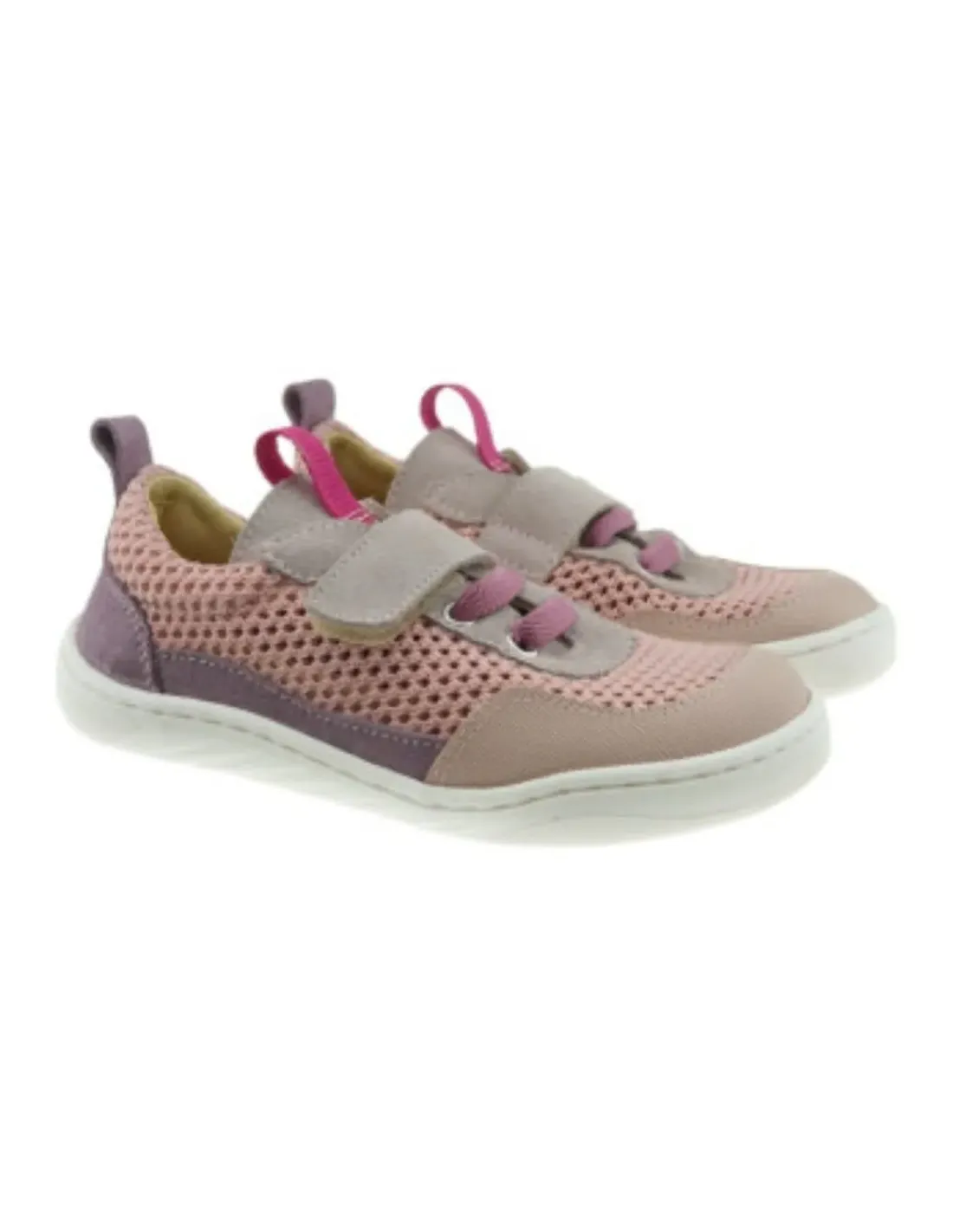 Deportiva textil de malla, de corte respetuoso, ligeras y transpirables. Cierre mediante velcro de ante con cordones elásticos, decorativos.  Forro textil con plantilla, de cuero, extraíble. Suela flexible y antideslizante, con puntera ancha y reforzada, sin drop, en goma.
