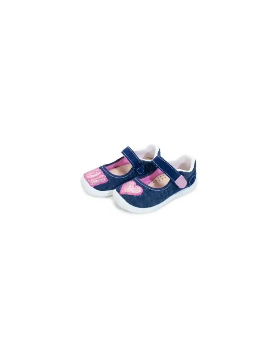 Mercedes en lona vaquera con diseño dúo: corazón y palabra "love" Cierre mediante correa de velcro. Forro textil. Plantilla, extraíble, de cuero, para una mejor transpiración del pie. Suela sin drop, de goma antideslizante, con talonera y puntera protegida.
