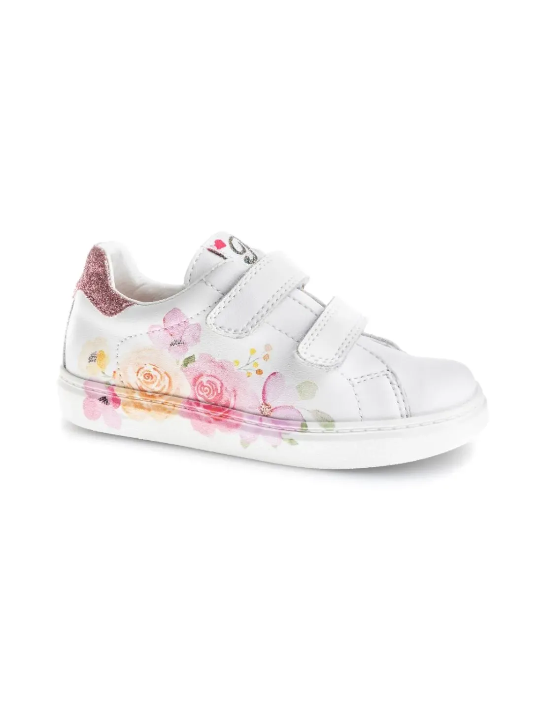 Deportivo en piel natural con cierre de doble velcro. Suela de goma sin drop. Corte respetuoso con puntera ancha. Diseño floral en el lateral exterior