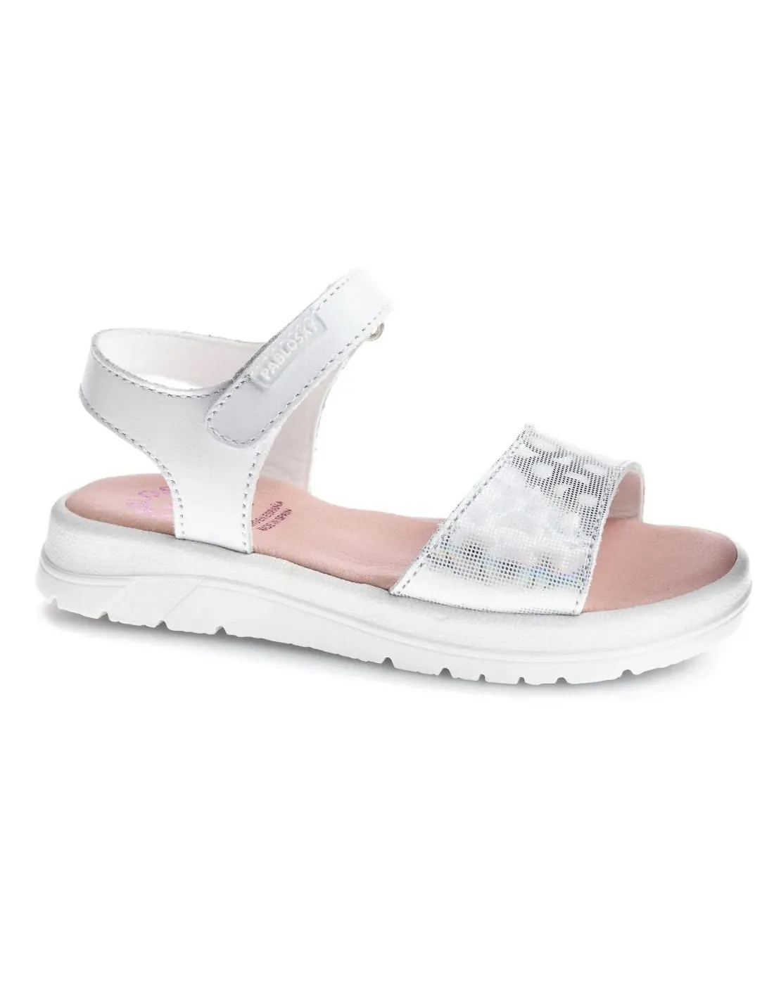 Sandalia en piel con cierre de velcro. Pala ancha biselada con toque plata y reflejos de colores. Plantilla acolchada de cuero y suela de goma antideslizante