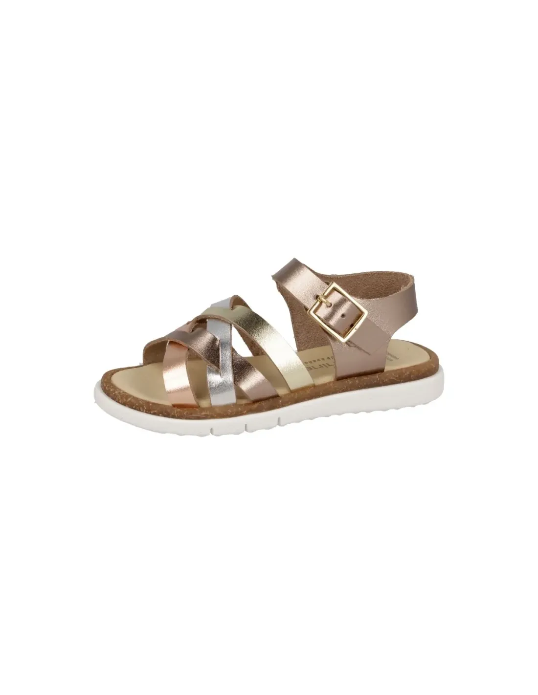Sandalia de piel metalizada con cierre de hebilla. Pala ancha de tiras entrelazadas en colores metalizados. Corte respetuoso con puntera ancha y suela de goma sin drop. Muy ligeras y flexibles