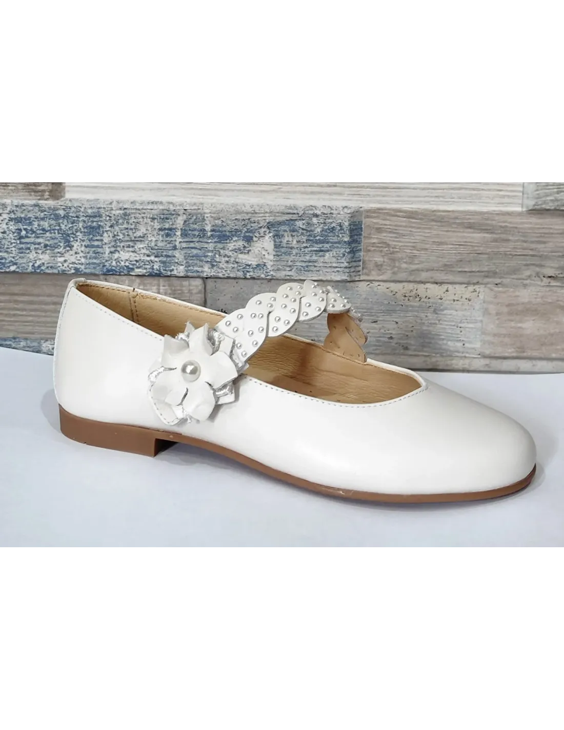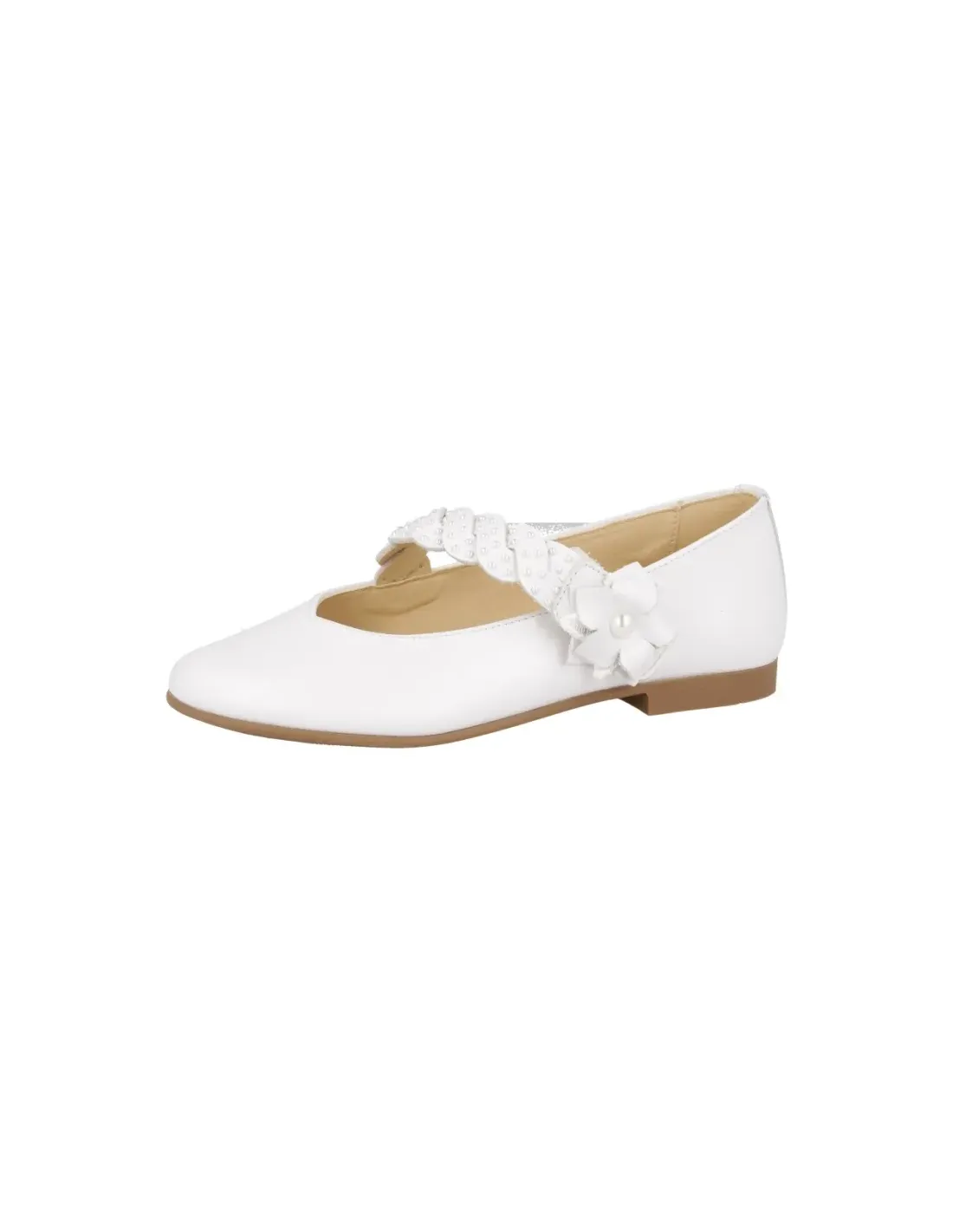 Zapato mercedes en piel nacarada con corte corazón, que estiliza la forma del pie. Correa trenzada con cierre de velcro, adornada con pedrería y finalizada en flor. Forro y plantilla, extraíble, de cuero. Suela de goma antideslizante. Ligeros y flexibles. Ideales para ceremonia