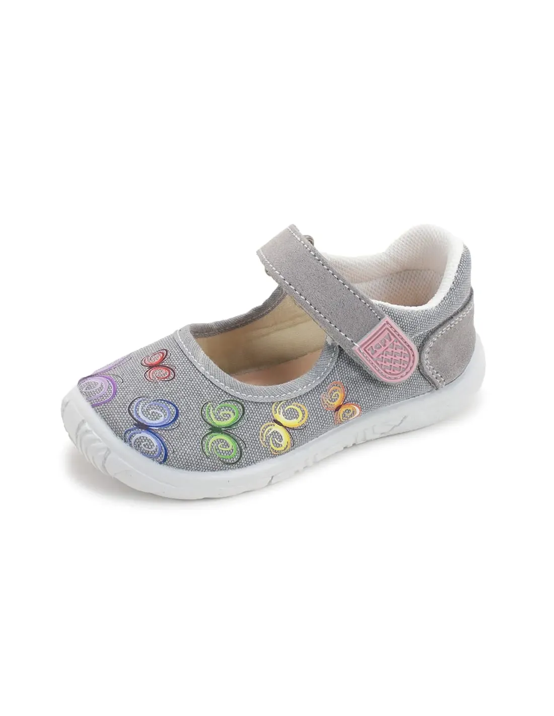 Mercedes textil con cierre de velcro. Forro textil y plantilla, extraíble, de cuero. Suela de goma sin drop, antideslizante. Corte respetuoso, muy ligera y flexible.