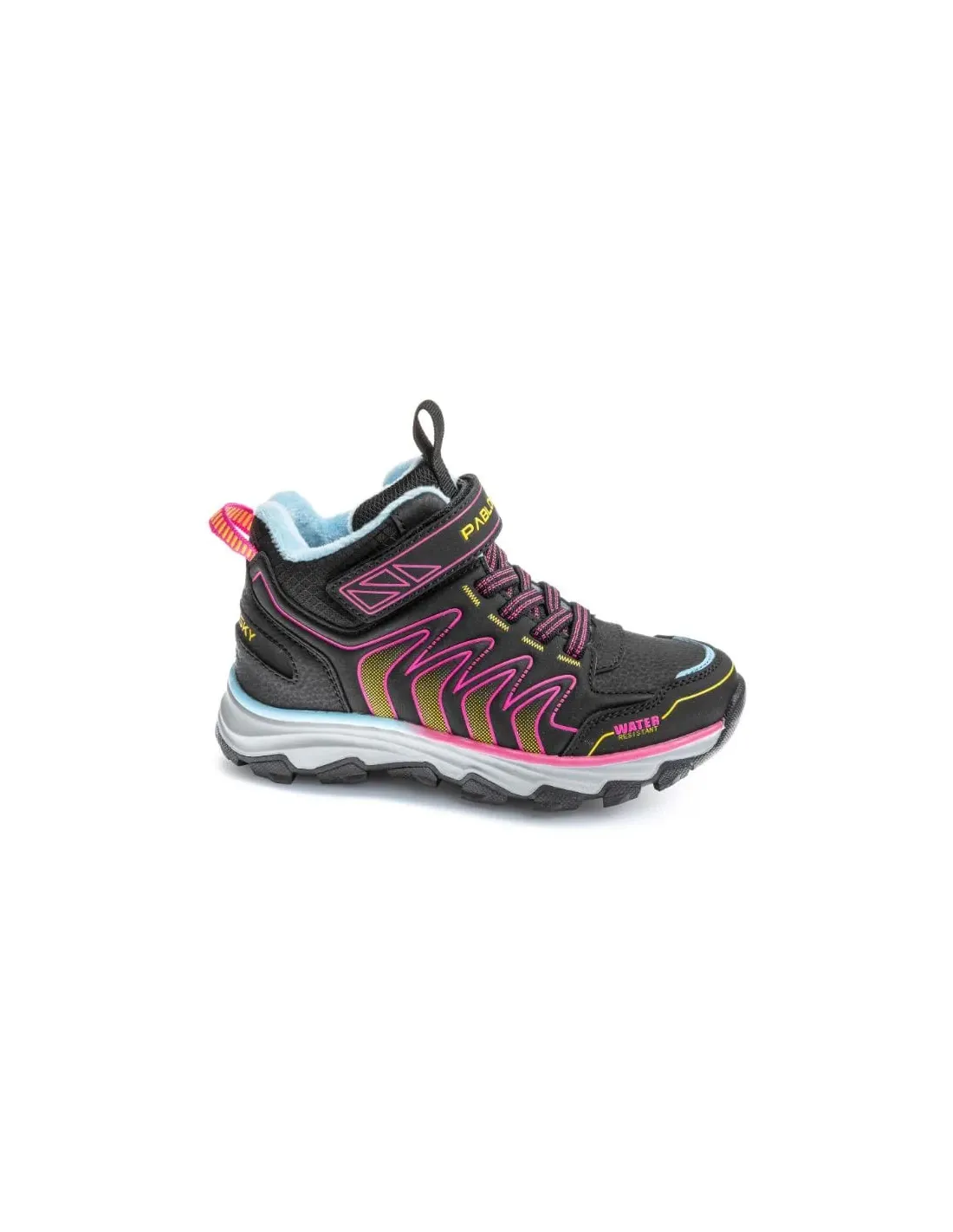 Bota de estilo trail y corte deportivo, en napa, con cierre mediante velcro y cordones elásticos. Forro textil. Suela de goma, serrada, antideslizante