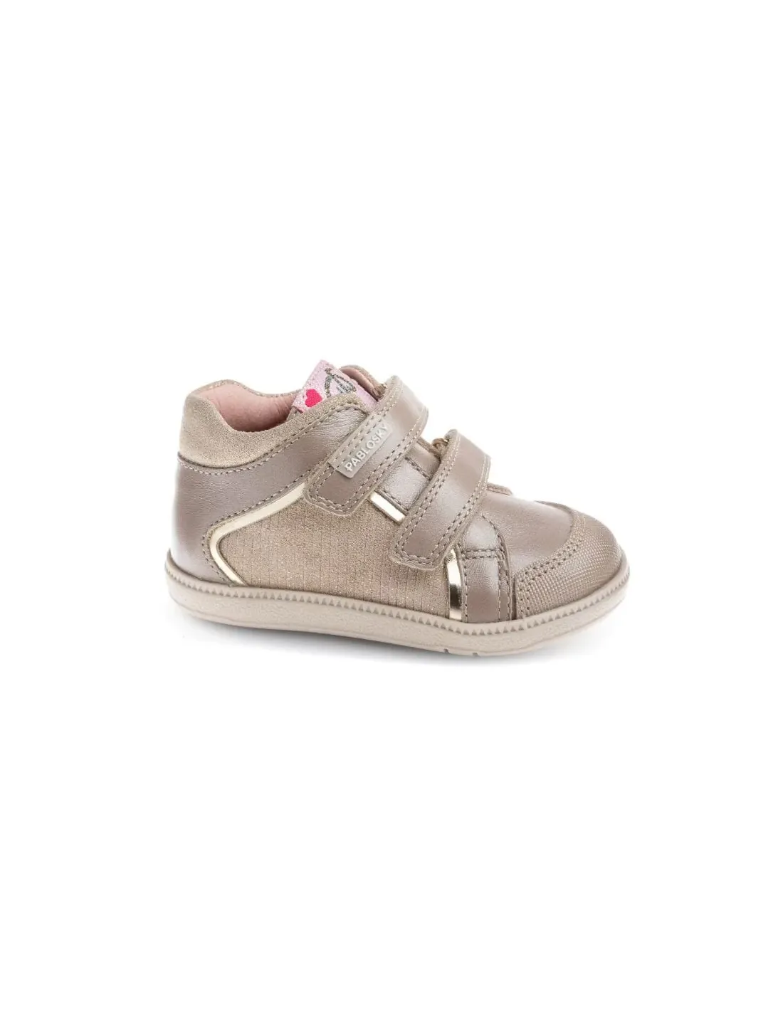 Bota en piel combinada con otras texturas y piezas metalizadas. Cierre mediante doble velcro. Puntera reforzada y ancha. Forro de cuero y plantilla extraíble. Suela de goma, antideslizante, sin drop, de corte respetuoso. Muy flexibles y ligeras