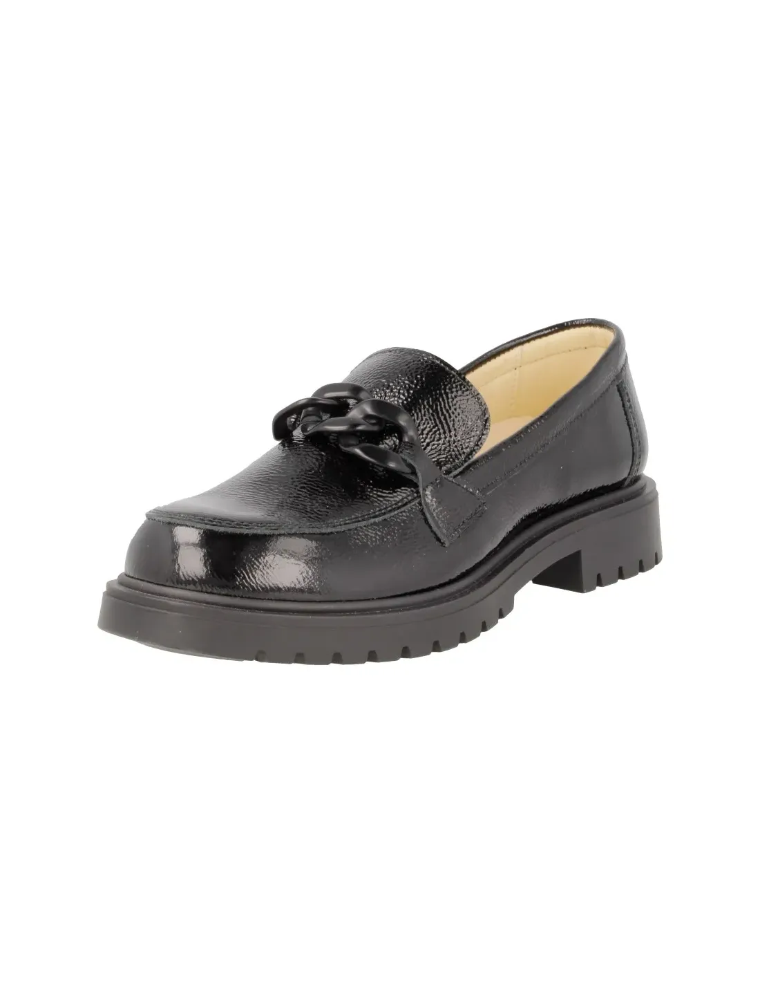 Zapato de corte mocasín, en piel, con adorno de cadena en empeine. Forro y plantilla, extraíble, de cuero. Suela de goma antideslizante.
