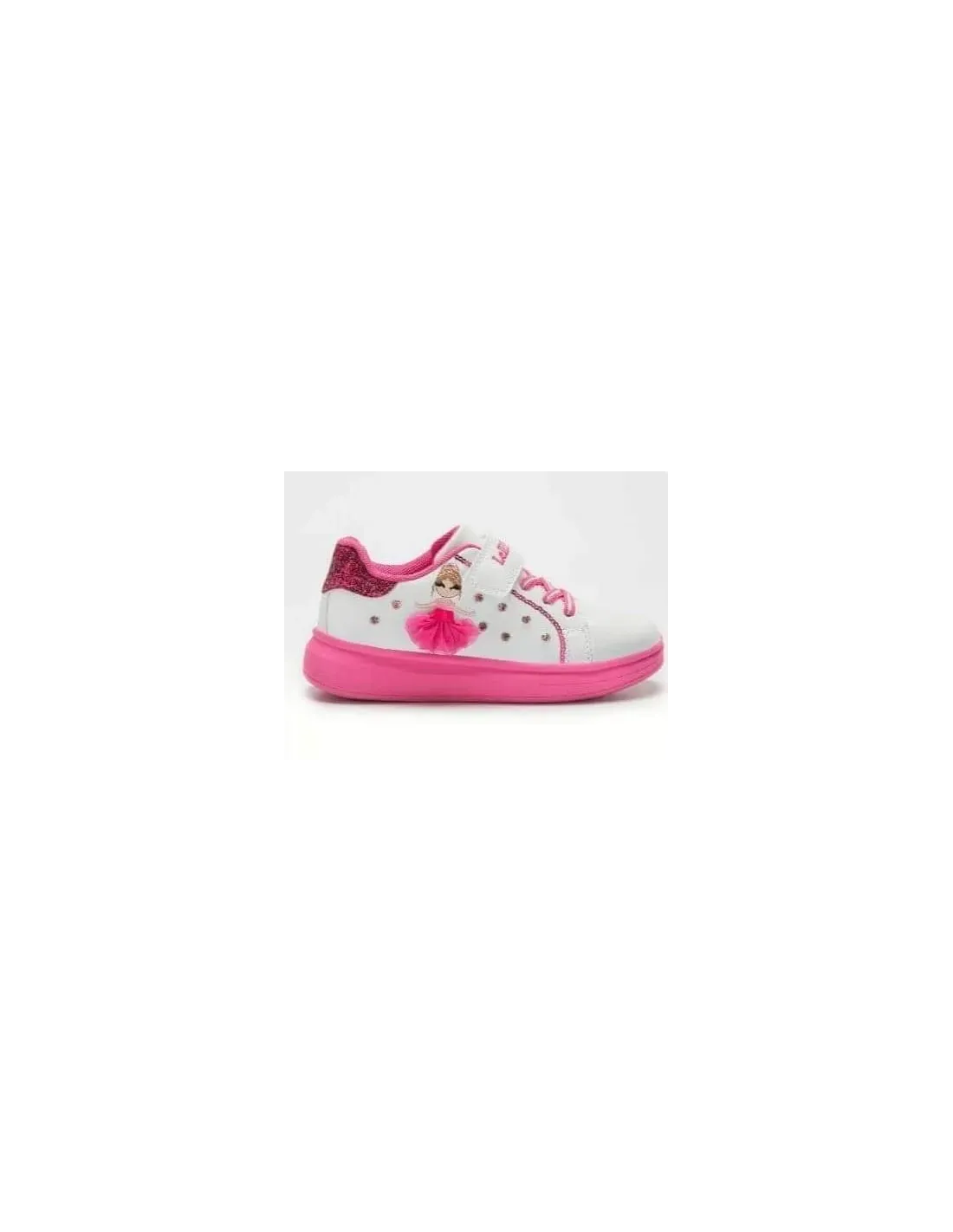 Deportivo en napa con diseño de bailarina y adornos de pedrería; los vestidos de la muñeca son intercambiables. Cierre mediante velcro y cordones elásticos. Forro de napa y plantilla textil. Suela de goma antideslizante
