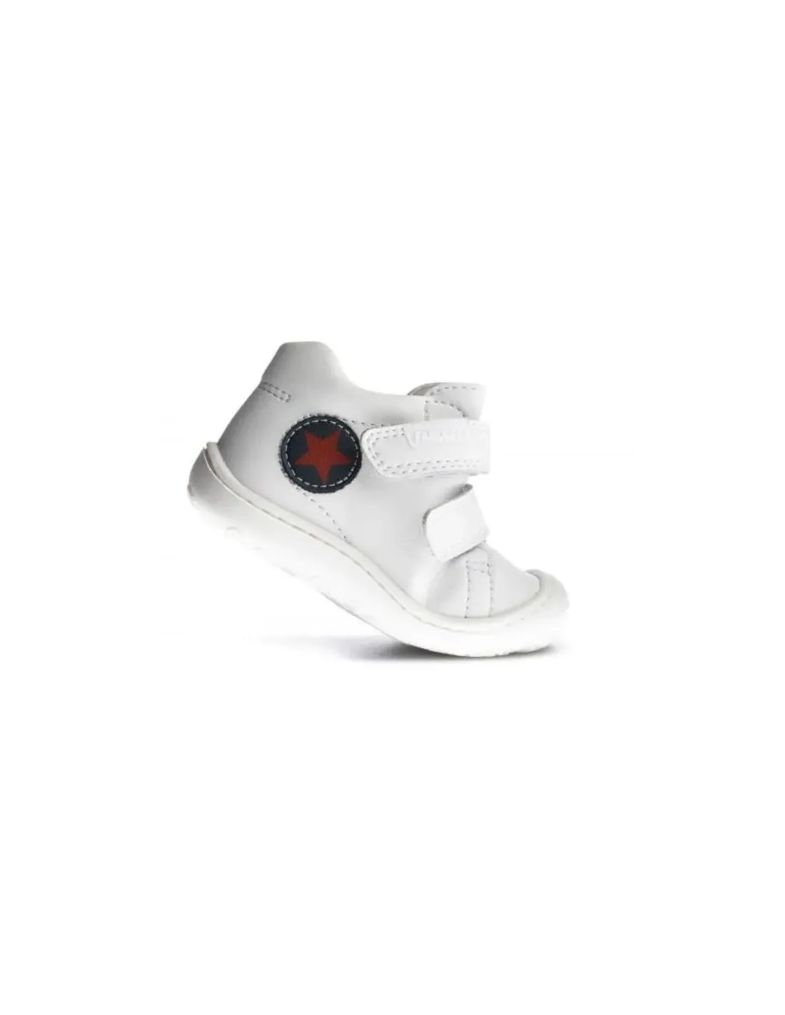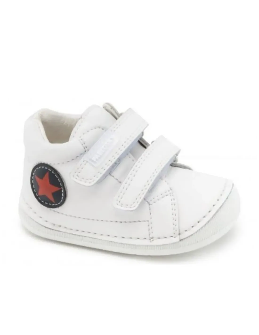Deportivo en piel natural, ideal primeros pasos. Cierre mediante doble velcro. Forro y plantilla, extraíble, de cuero. Suela de goma antideslizante, sin drop. Corte respetuoso, muy flexible y ligero.