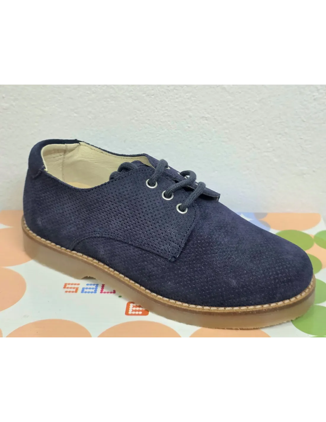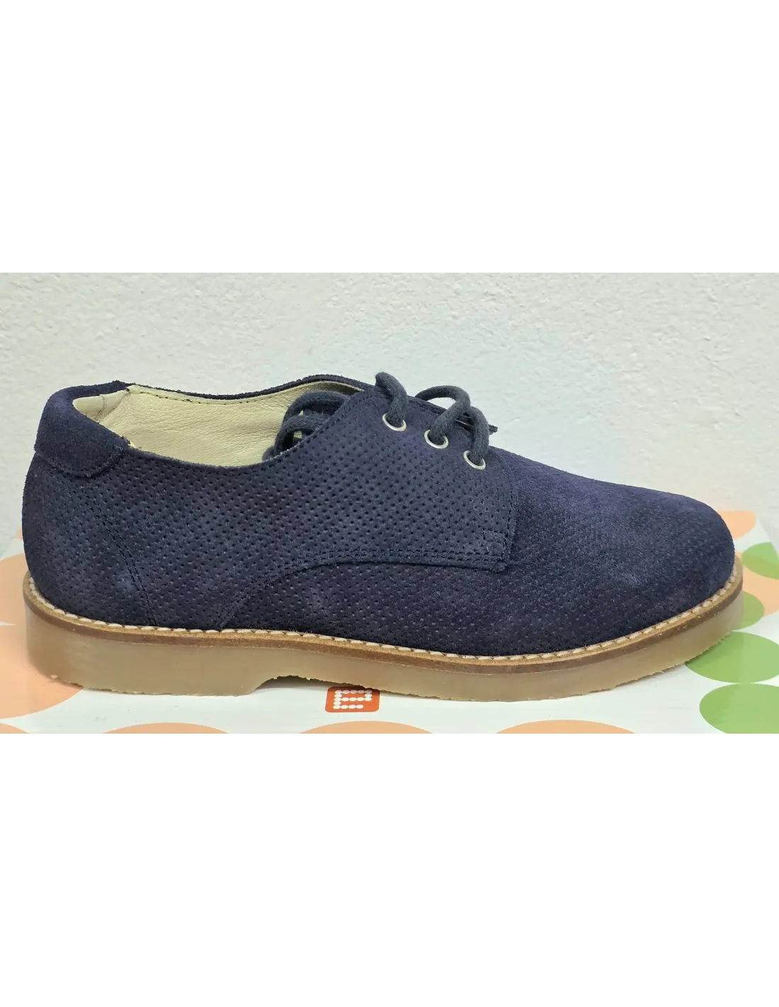 Zapato en serraje natural de tipo blucher. Cierre mediante cordones ajustables, de algodón. Forro y plantilla, extraíble, de cuero. Suela de goma antideslizante