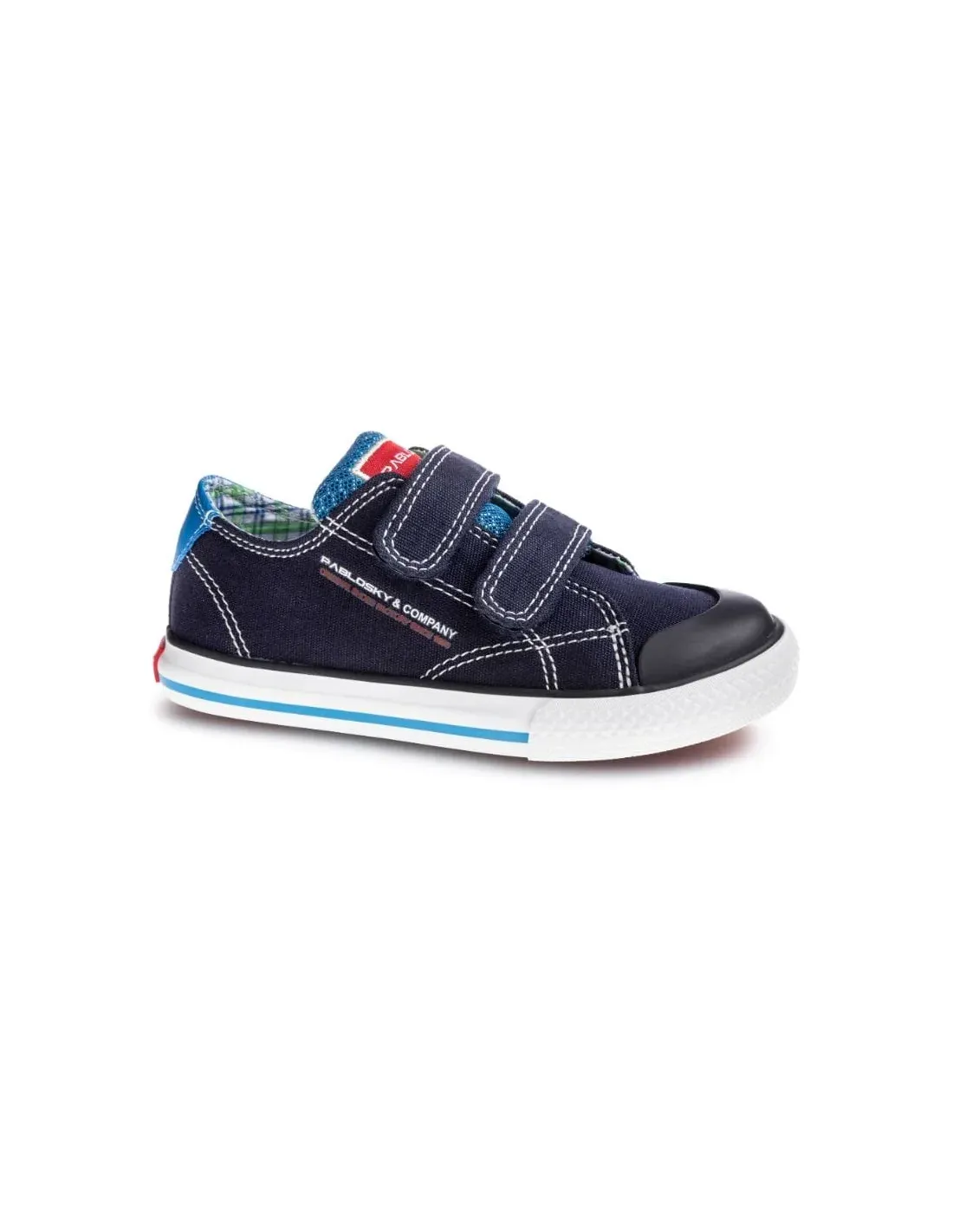 Lona textil con cierre de doble velcro y puntera engomada. Forro textil con plantilla educativa. Suela de goma antideslizante