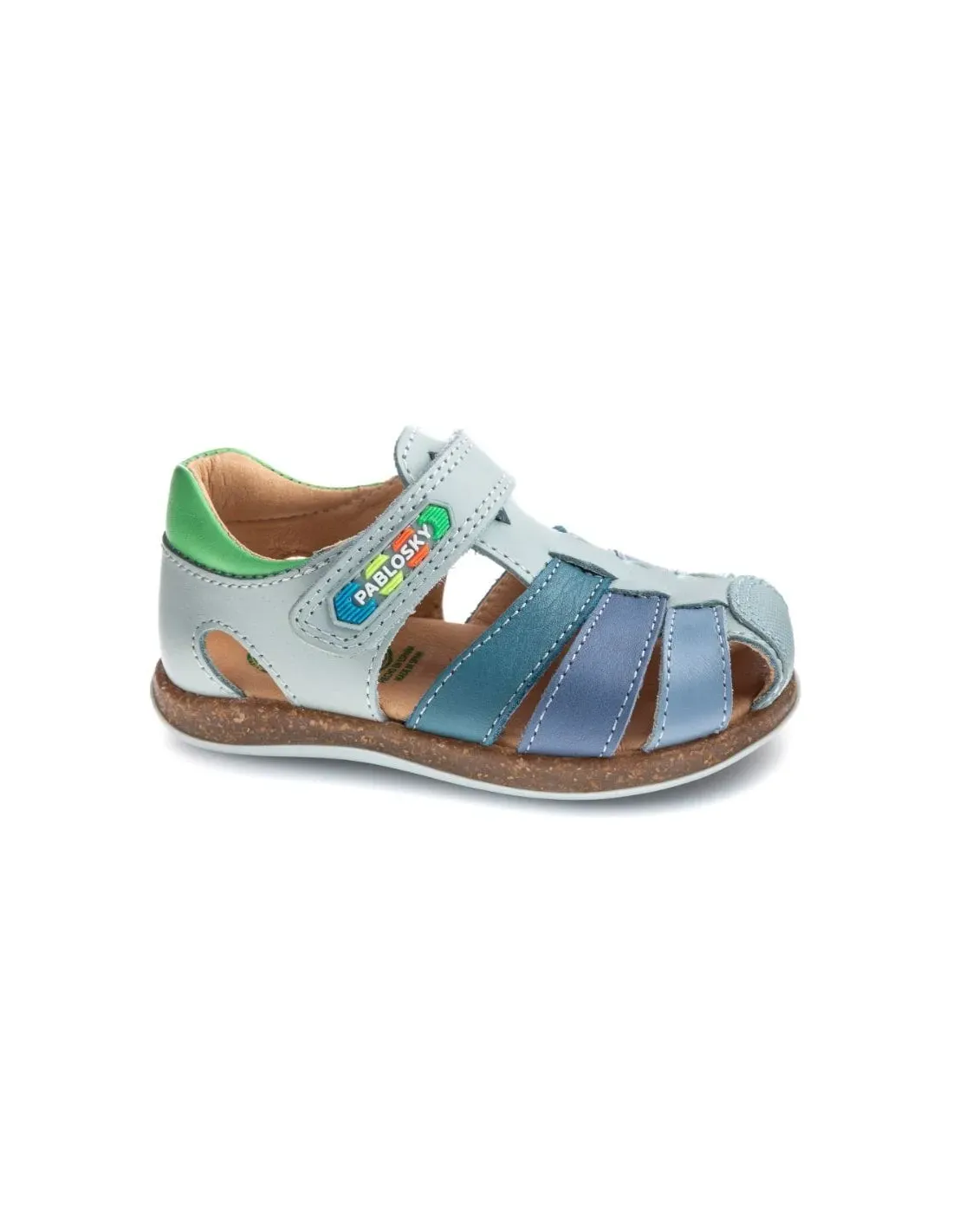 Sandalia en piel multicolor con cierre de velcro y puntera reforzada. Plantilla de cuero y suela de goma antideslizante