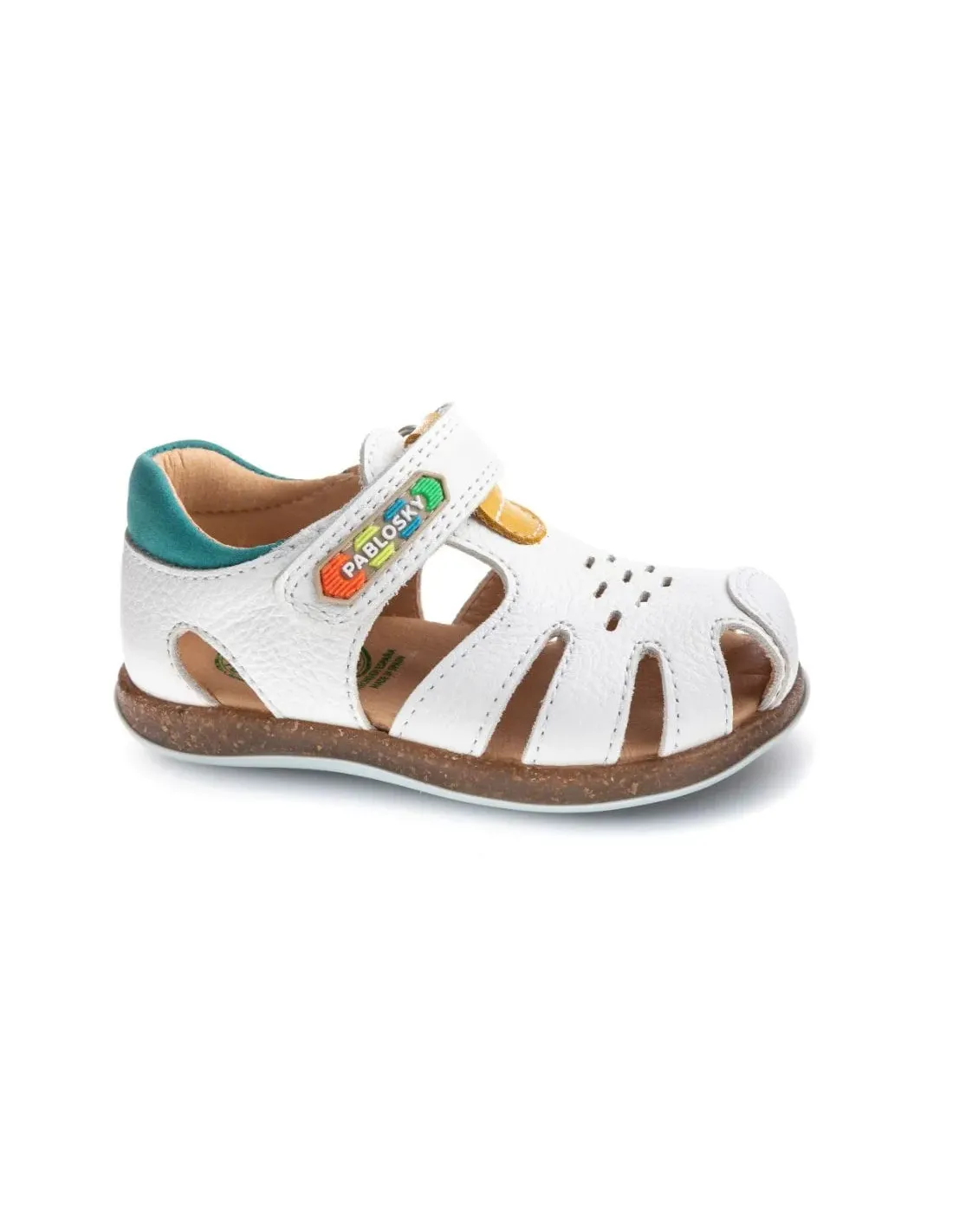 Sandalia en piel con puntera reforzada, plantilla de cuero y cierre de velcro. Suela de goma antideslizante