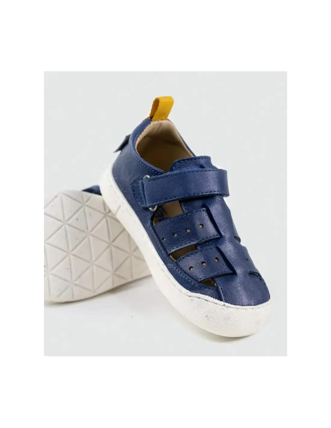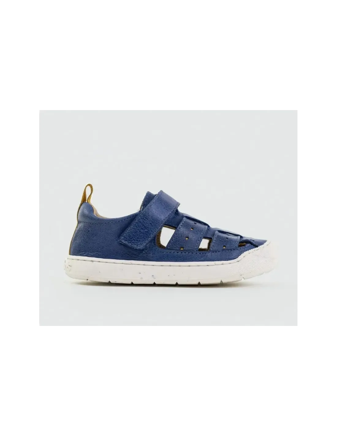 Sandalia barefoot en piel  con puntera ancha y suela de goma, reciclada, muy flexible. Con puntera reforzada y cierre de velcro. Transpirable, antibacteriana y amortiguada.