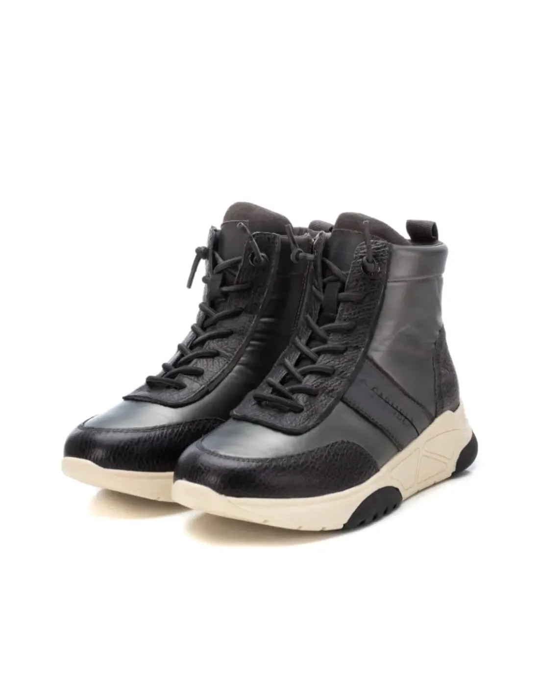 Botín deportivo fabricado en piel y nylon metalizado. Cierre mediante cremallera lateral y cordones elásticos ajustables. Tirador trasero que facilita la puesta. Plantilla acolchada de descanso. Suela en volumen de goma antideslizante.