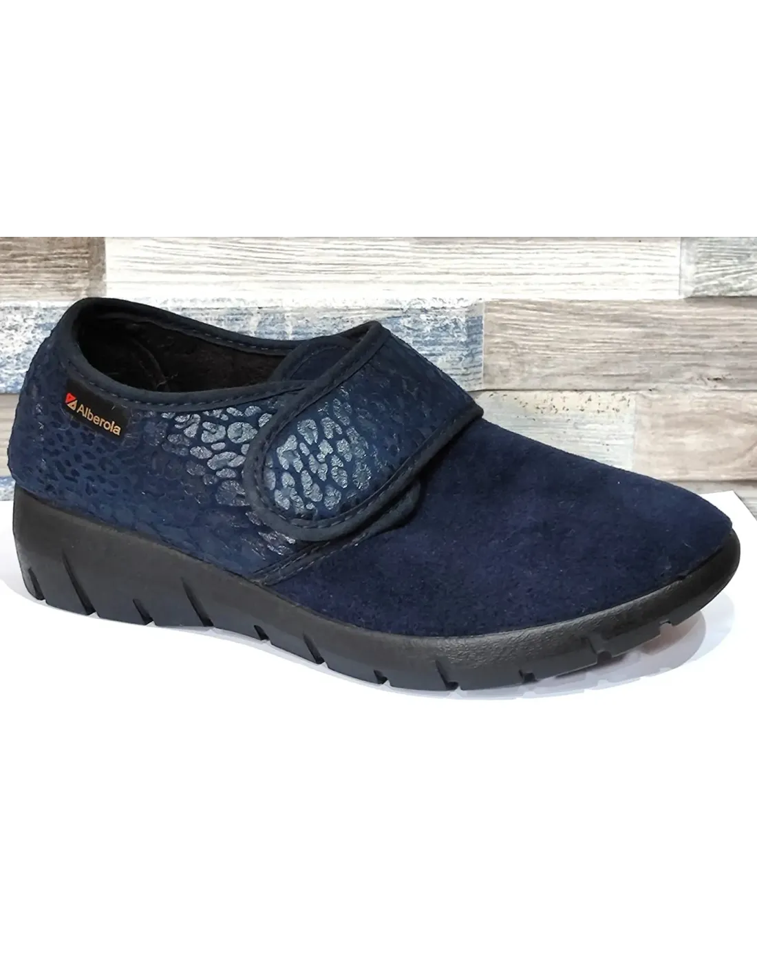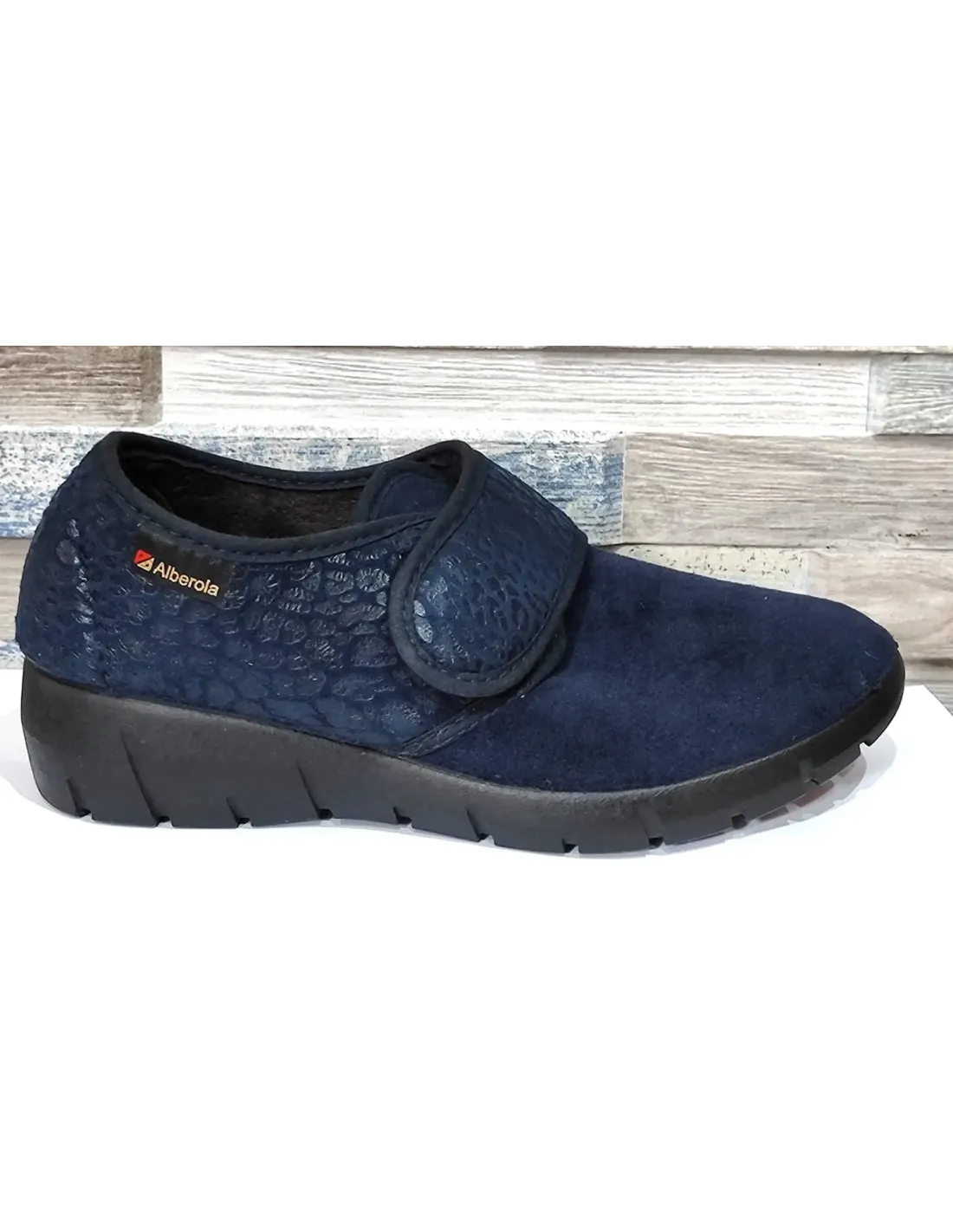 Zapatilla de casa, también para exterior, en serraje y textil. Cierre mediante velcro ancho. Forro afelpado con plantilla acolchada. Suela serrada en goma antideslizante