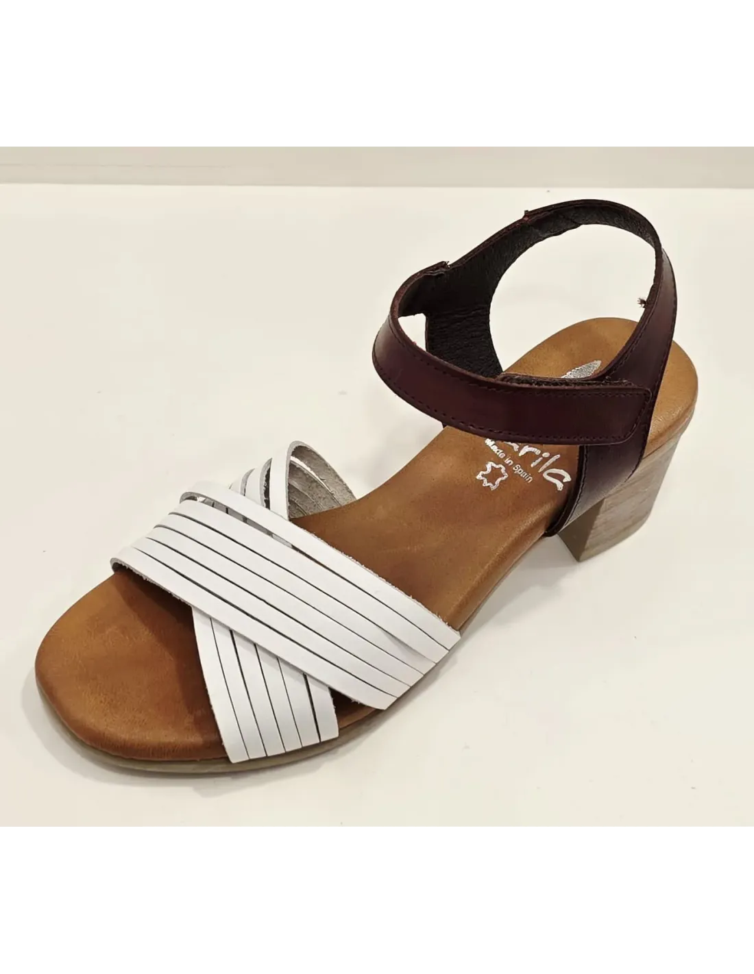 Sandalia en piel natural con pala de tiras cruzadas, formada por tiras más finas. Cierre mediante correa de velcro al tobillo. Plantilla acolchada con 5 mm de espesor, en cuero que permite la correcta transpiración del pie. Tacón medio ancho con efecto madera. Suela de goma antideslizante.
