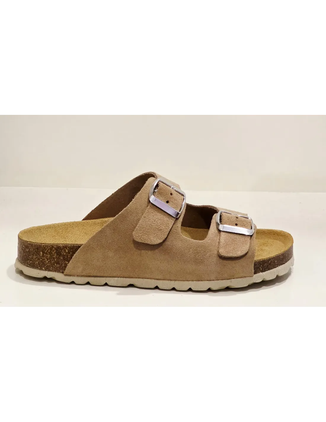 Sandalia con plantilla bio, anatómica, de descanso. Cierre ajustable mediante velcros con diseño de hebillas metálicas, decorativas. Suela serrada de goma antideslizante