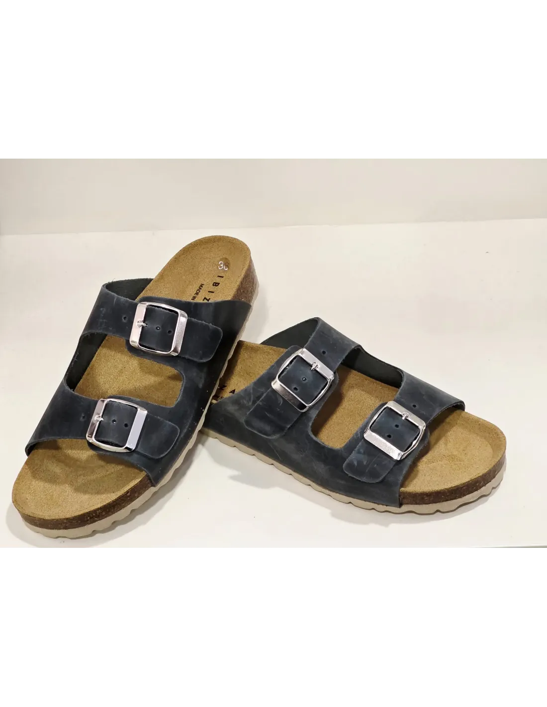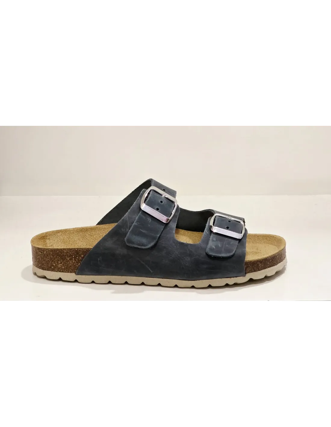 Sandalia con plantilla bio, anatómica, de descanso. Cierre ajustable mediante velcros con diseño de hebillas metálicas, decorativas. Suela serrada de goma antideslizante