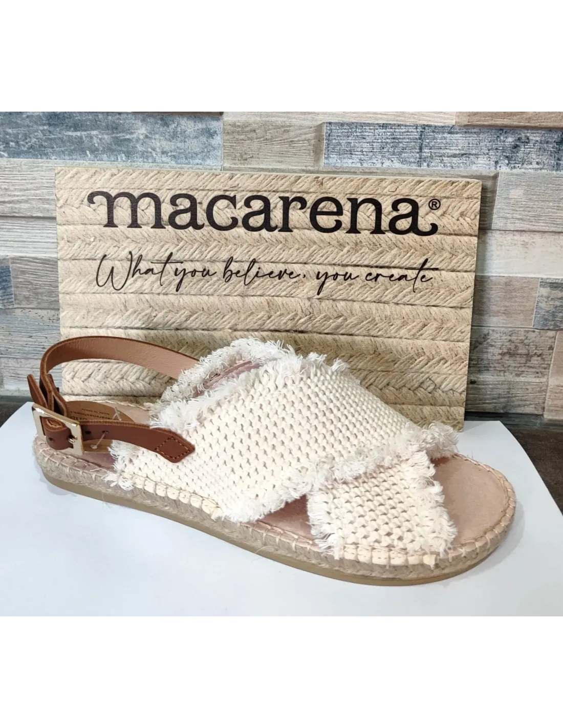 Sandalia en algodón orgánico, de pala cruzada. Sujeción mediante correa de cuero, en hebilla. Plantilla acolchada de descanso. Suela de yute natural acabada en goma antideslizante.