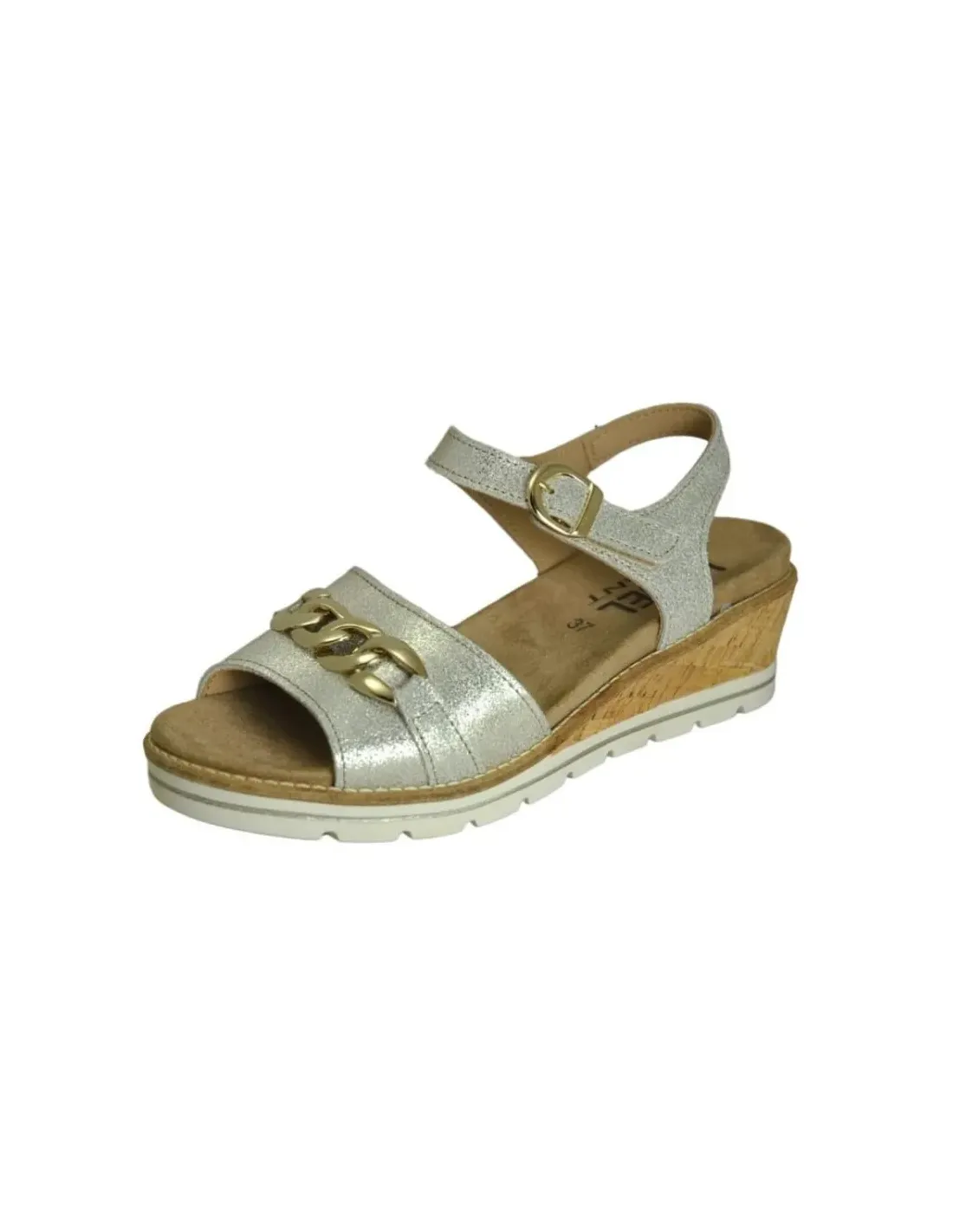 Sandalia en piel metalizada con pala adornada con hebilla metalizada y cierre mediante pulsera, al tobillo, de hebilla. Plantilla anatómica extraíble, ideal para personas que llevan plantilla ortopédica. Suela de cuña baja en goma antideslizante.