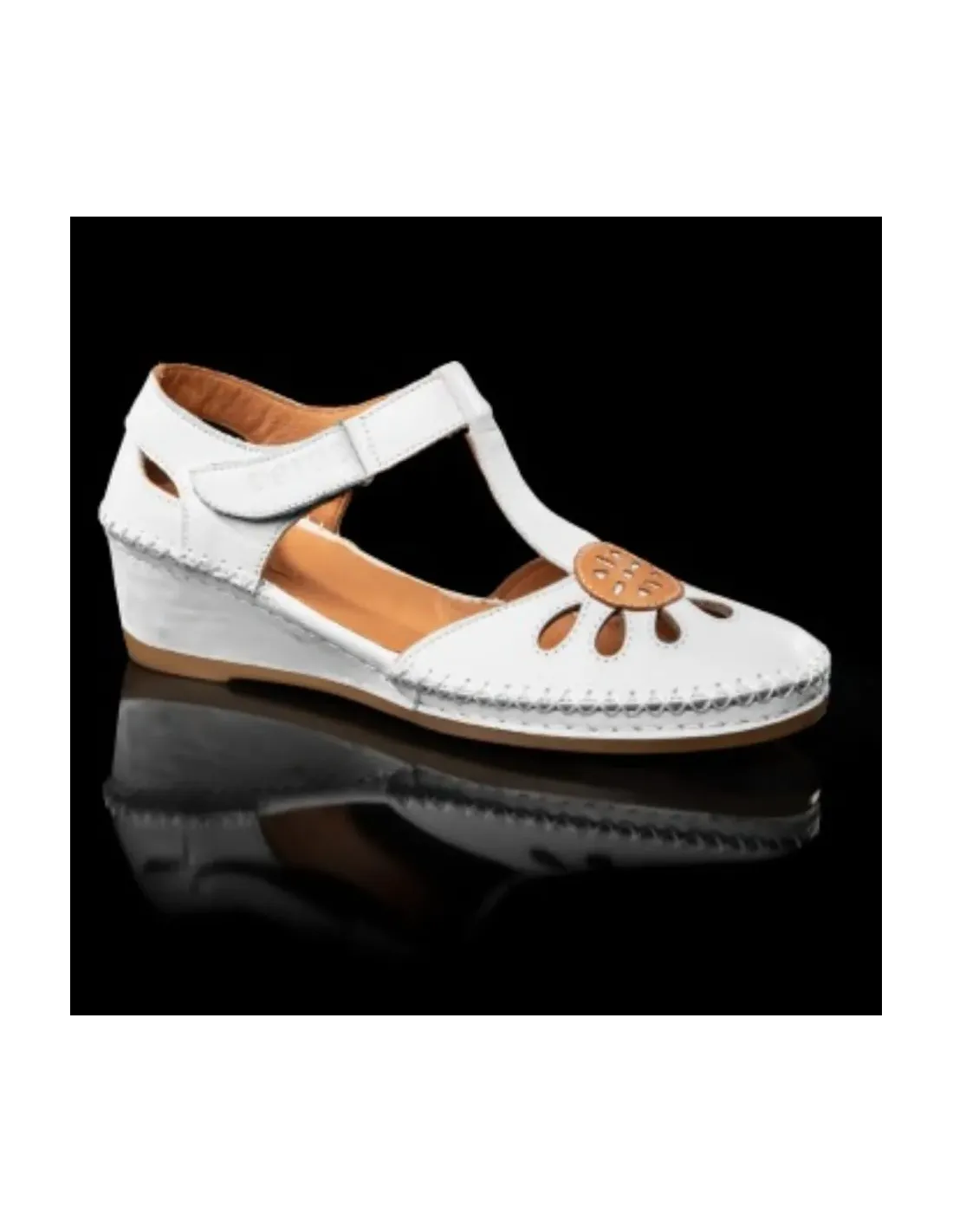 Sandalia en piel con puntera y talonera cerradas. Corte camiseta que acaba en pulsera, al tobillo, ajustable por velcro. Plantilla, acolchada. en cuero. Suela con cuña sobre suela de goma antideslizante. Muy ligeras y super flexibles