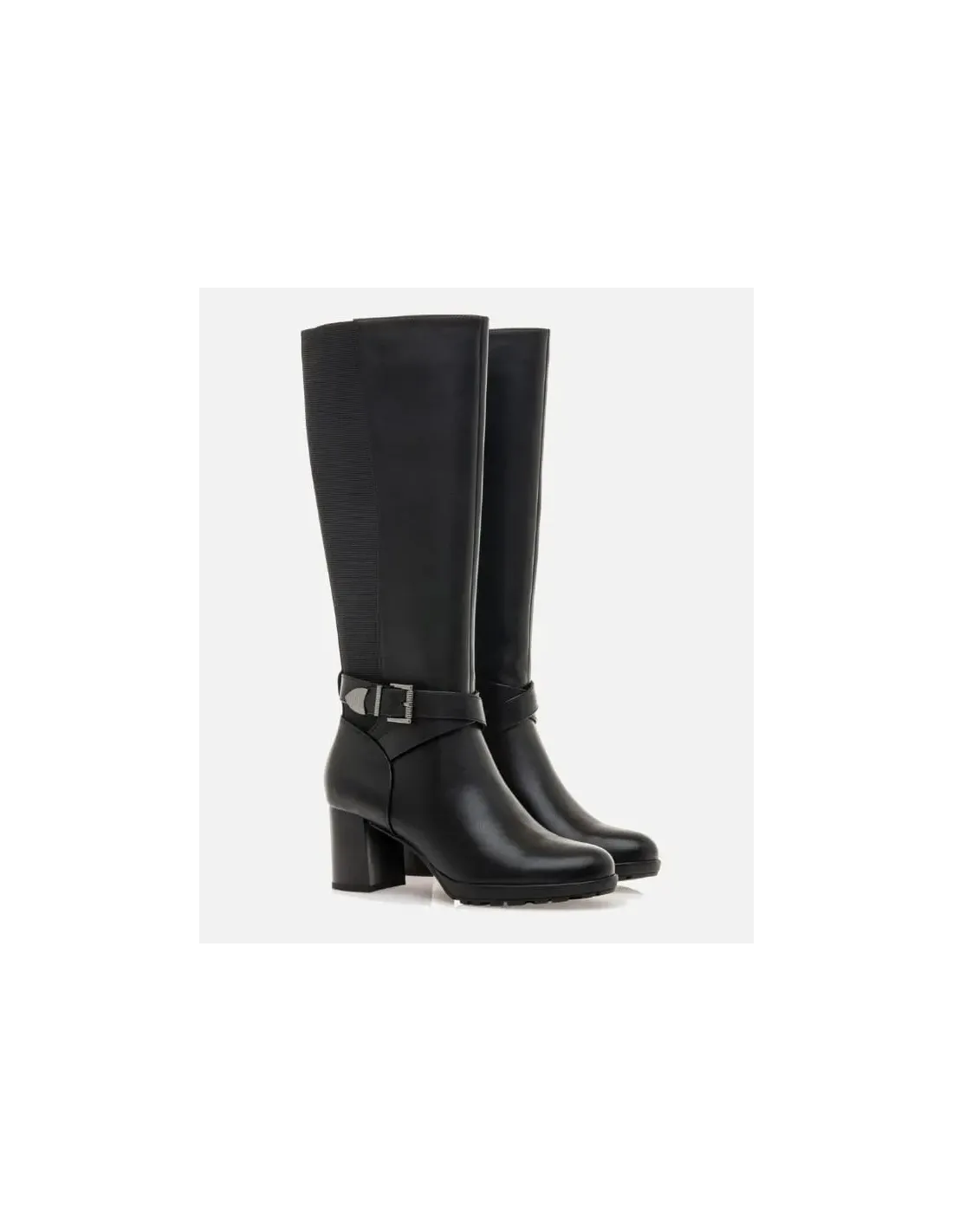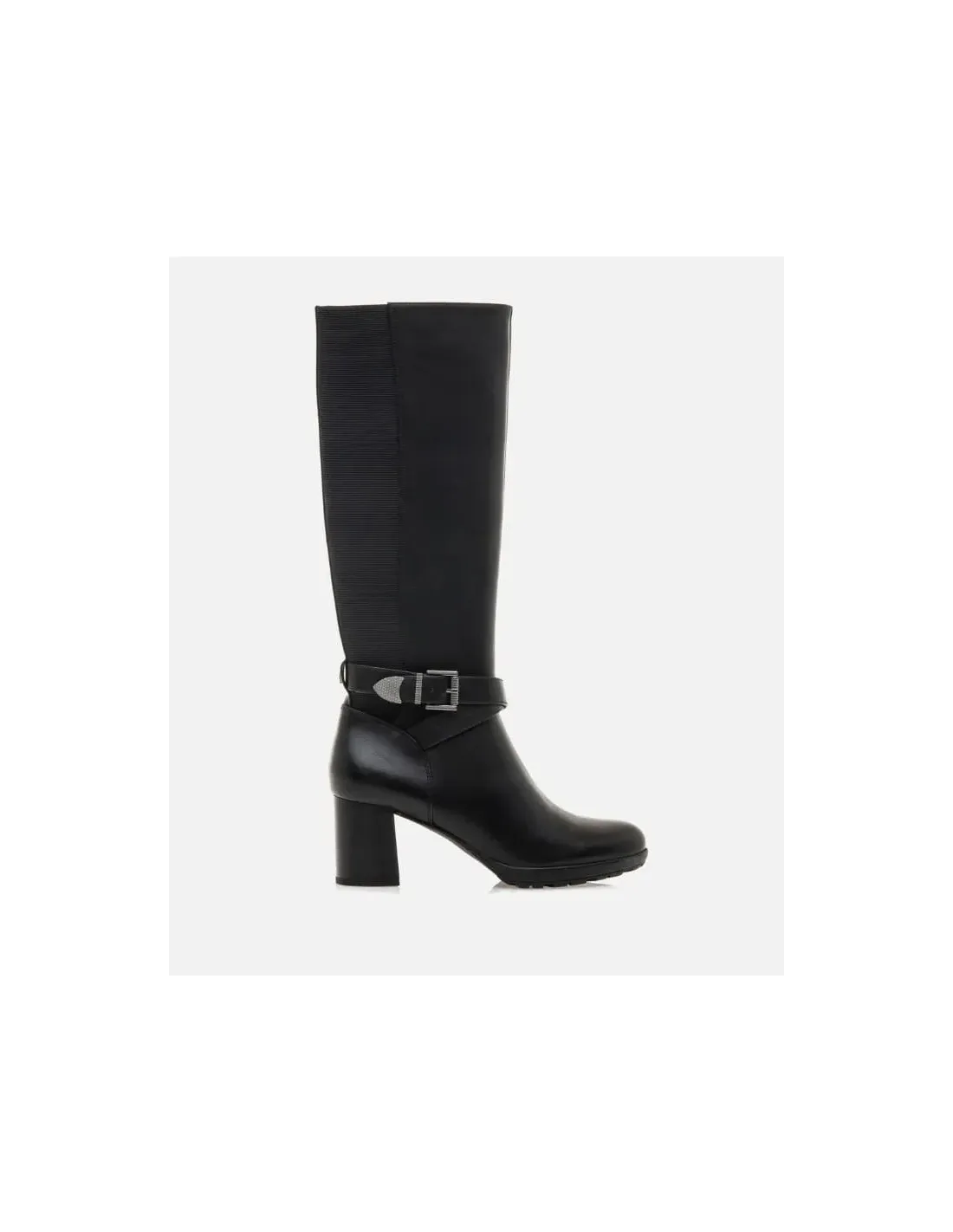 Bota de caña alta, en napa. Cierre de cremallera lateral. Tacón cuadrado de 6 cm de altura. Horma almendrada con puntera ancha. Adorno de hebilla plateada. Suela de goma
